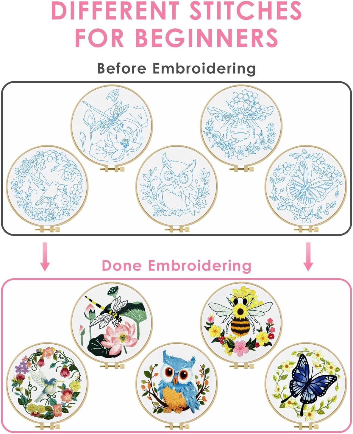 【Suitable for Beginners】This DIY embroidery style is simple and diverse, no complicated pattern design, suitable for beginners. The different stitch method that spark your creativity to a new pattern.