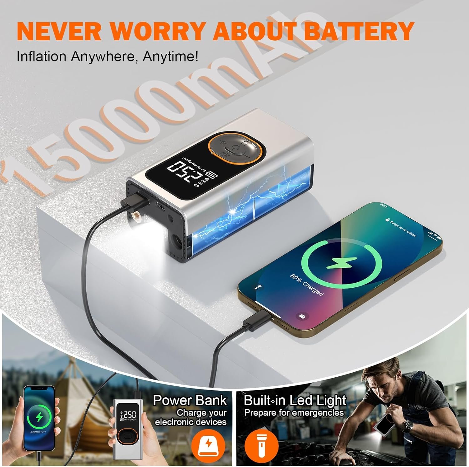 High-Capacity Battery, Long-Lasting Power: Powered by a large-capacity battery 15000mAh, this inflator provides extended runtime, allowing you to inflate multiple tires or items without worrying about power loss. A single charge can inflate up to 8 car tires or 30 bicycle tires