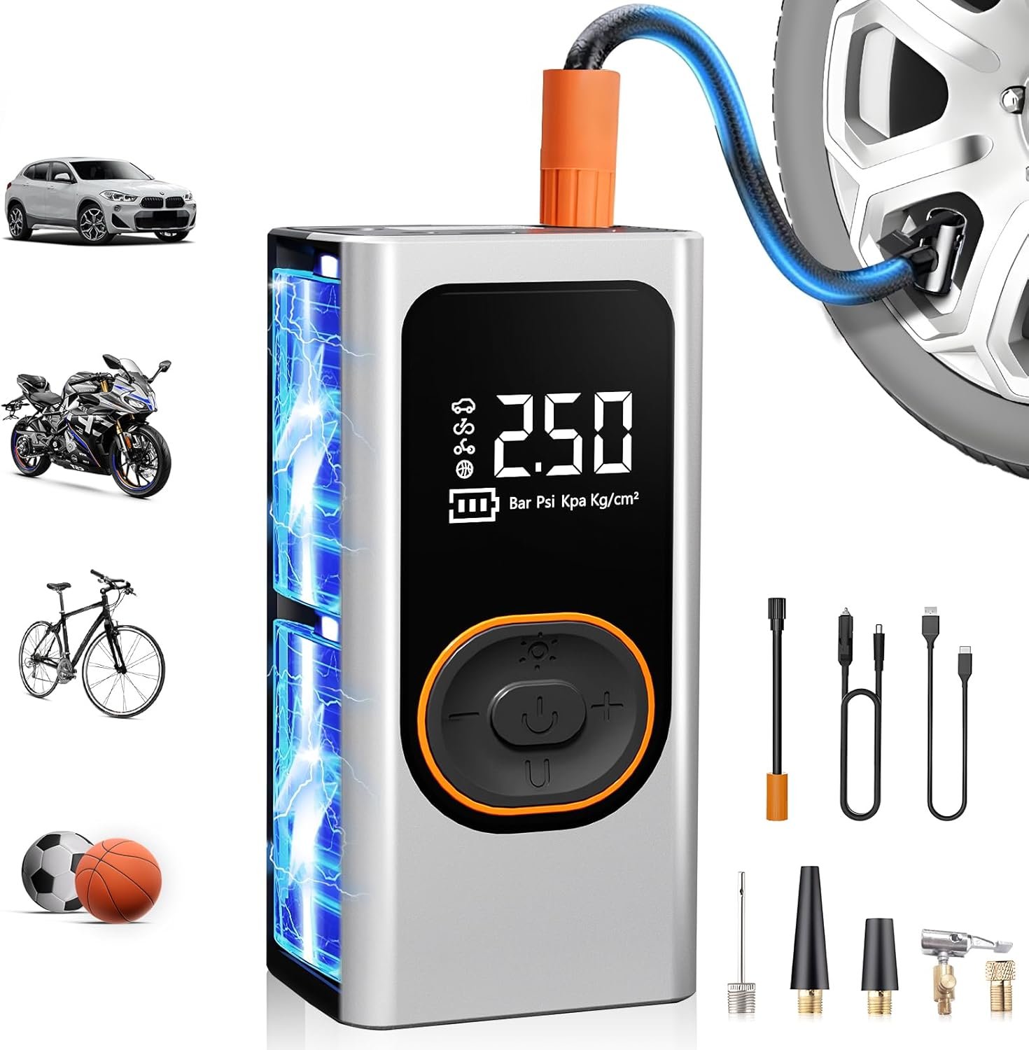 Versatile Design for Multiple Uses: Offers multiple preset modes and supports various pressure units. Suitable for inflating tires, sports balls, inflatables, etc., making it a versatile tool for all your inflation needs as a tire inflator and wheel & tire air compressors & inflators