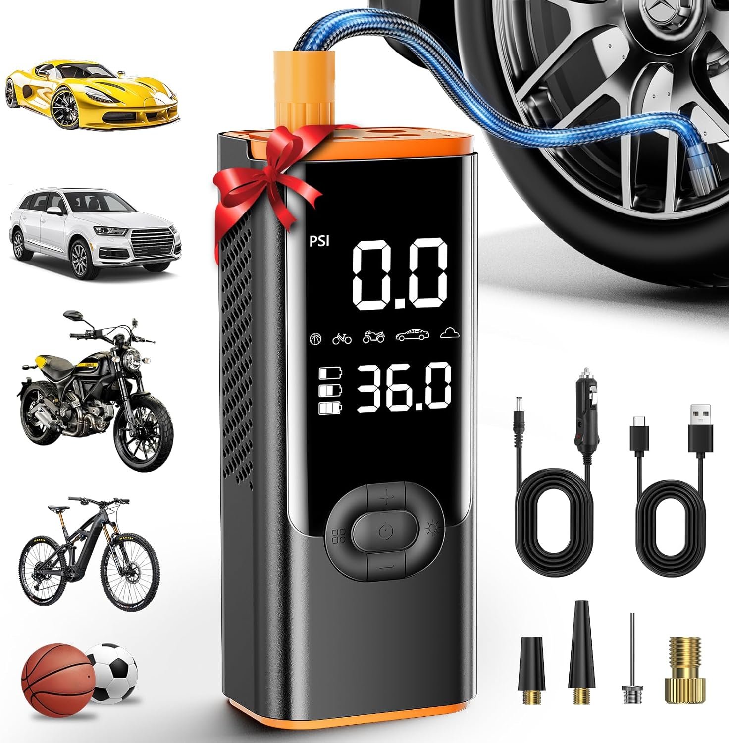 【4X Faster Inflation & Highly Accurate】Car tire air pump portable is the latest design from 2024, and it comes with a high-efficiency motor that boosts inflation speeds up to 36L/Min, so it takes less than 5 minutes to inflate a 195/65/R15 car tire from 0 psi to 35 psi. In addition, our tire inflator portable air compressor is maintained at ±1%. It’s the perfect companion for the road!