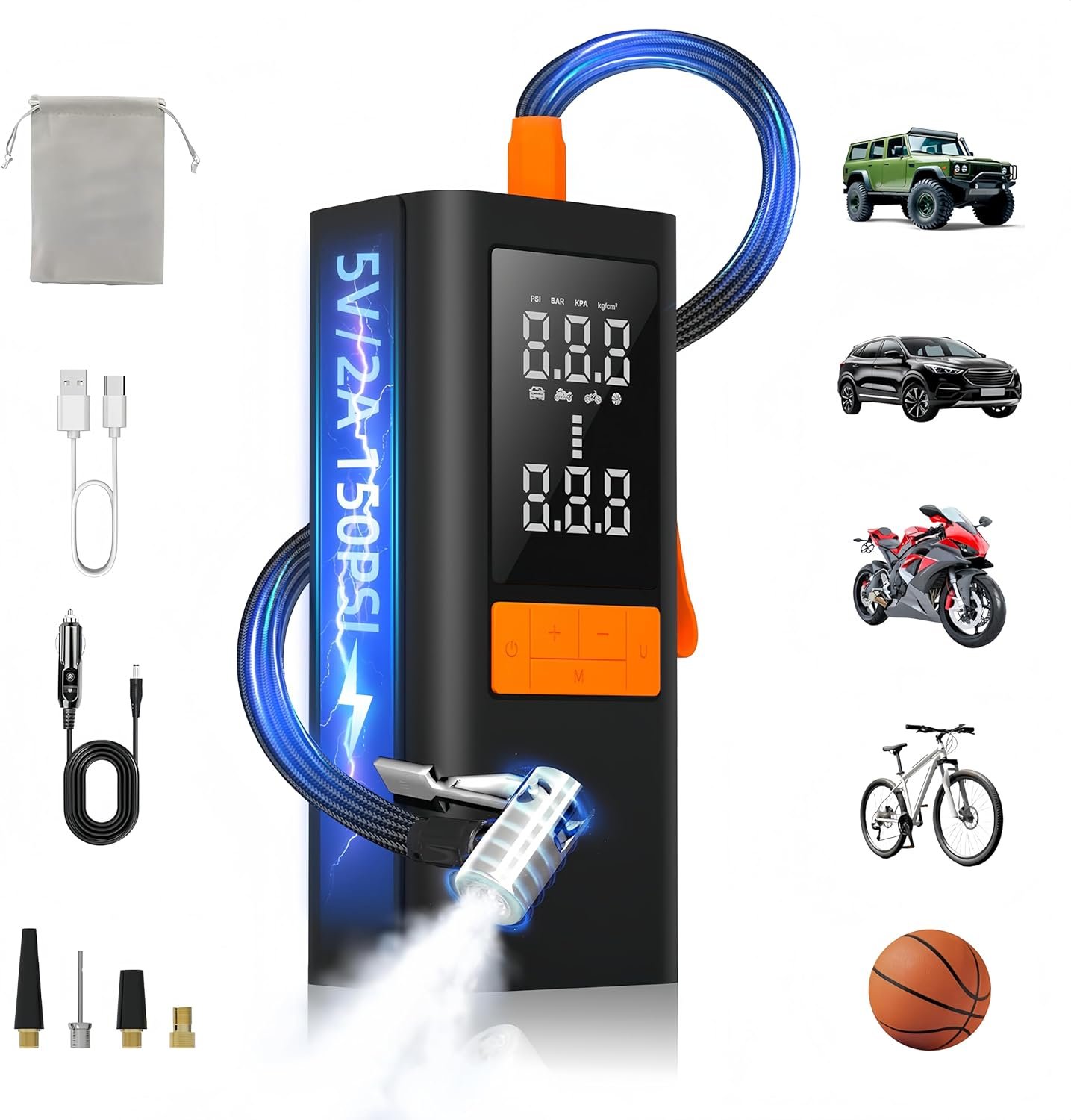 Tire Inflator Portable Air Compressor Air Pump for Car Tires Air Compressor with Digital Pressure Gauge,150PSI Tire Inflator with Auto Shut Off LED Light Power Bank for Car Motorcycle Bike Balls