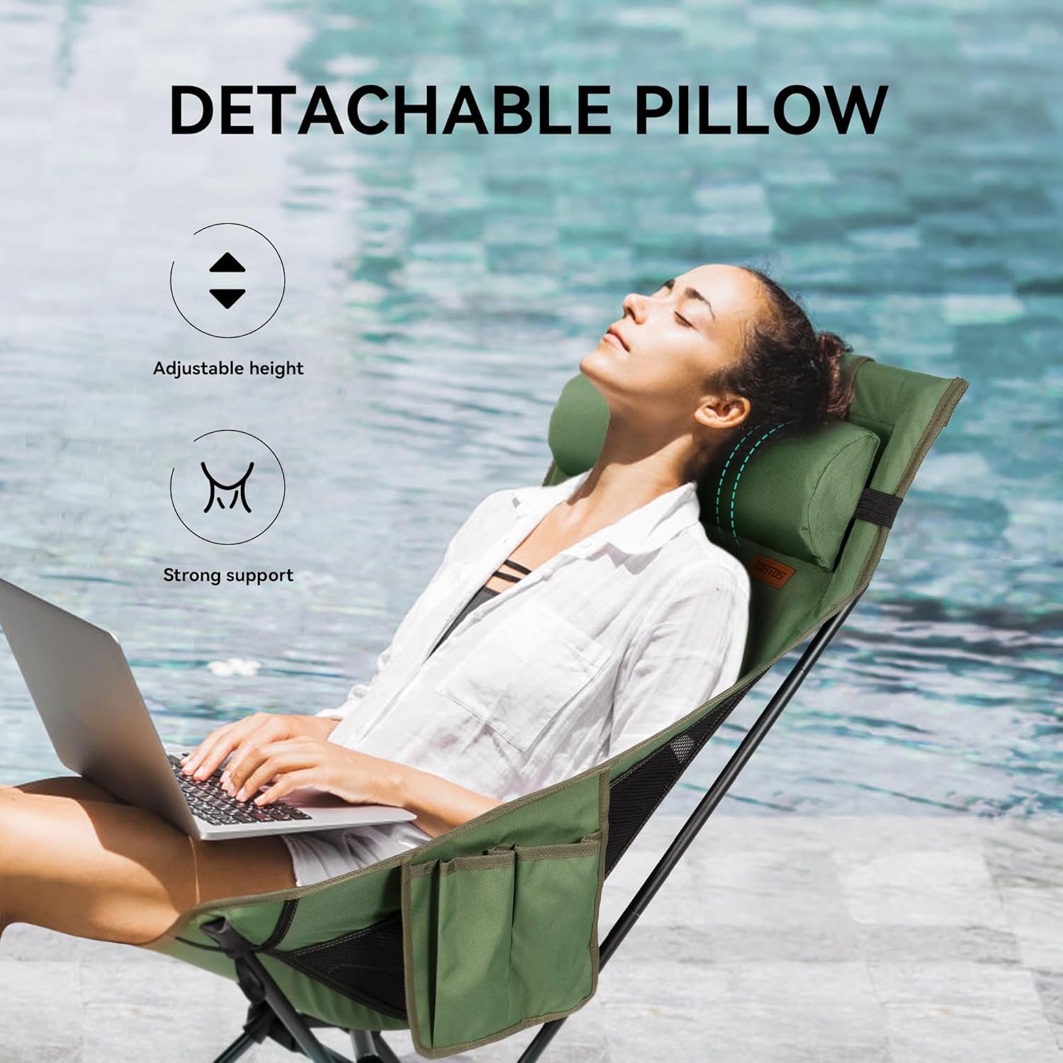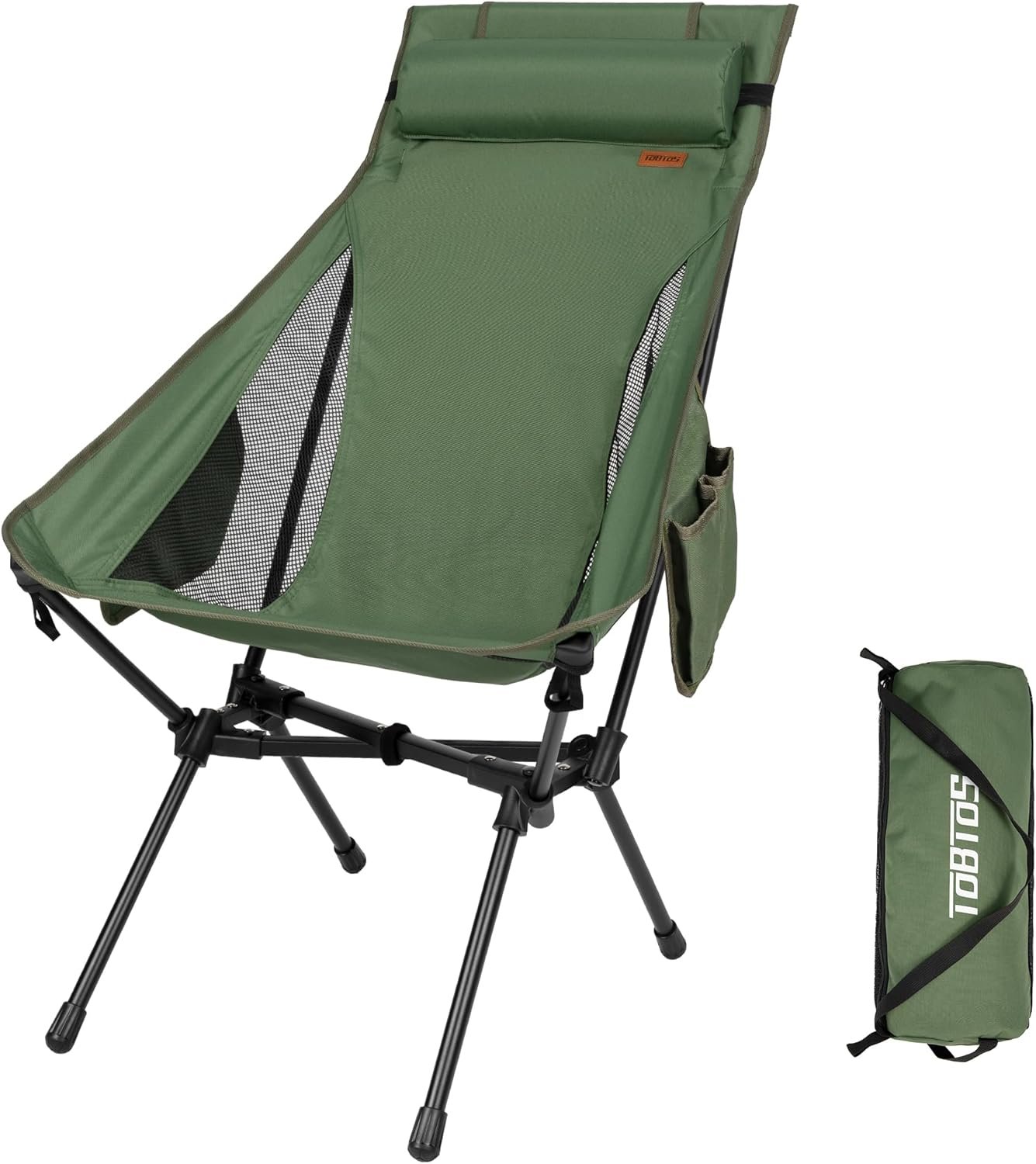 TOBTOS Portable High Back Camping Chair, Support Heavy Duty 440 lbs, Compact Folding Chair with Detachable Pillow for Camp, Hiking, Backpacking (Green)