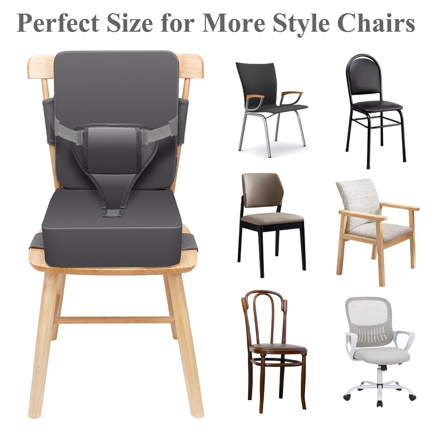 Compared to other single booster seats, our kitchen chair booster seat adds a backrest cushion, and a three-point protection design safety straps and buckets at the front of the cushion to give your child a more comfortable and safer protection.