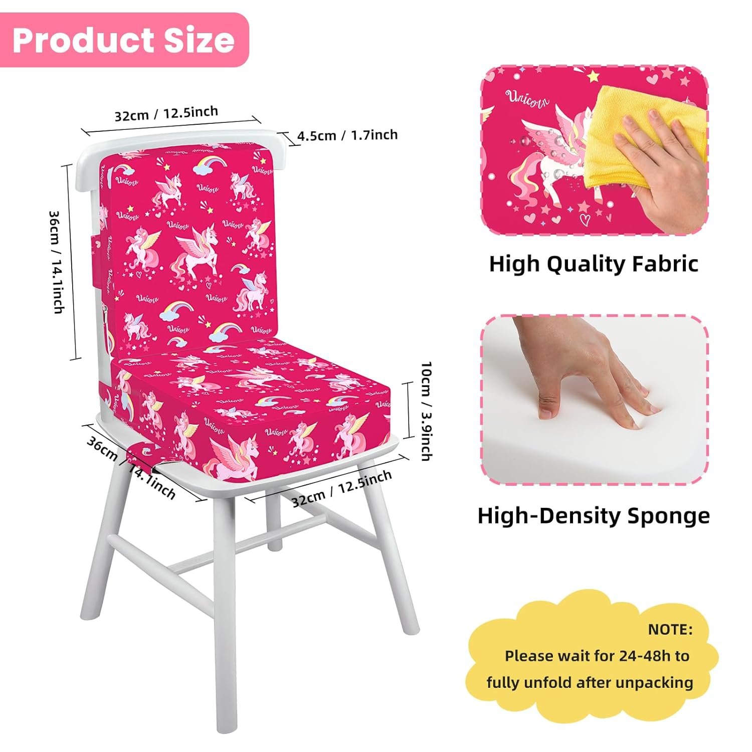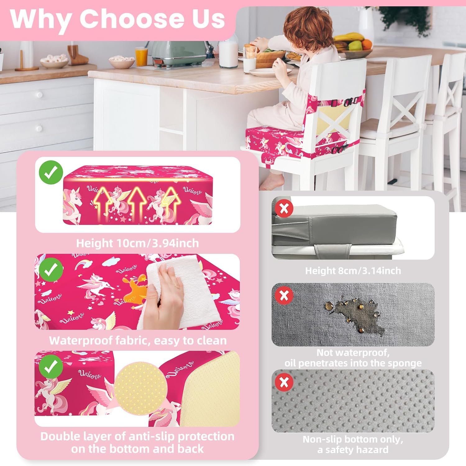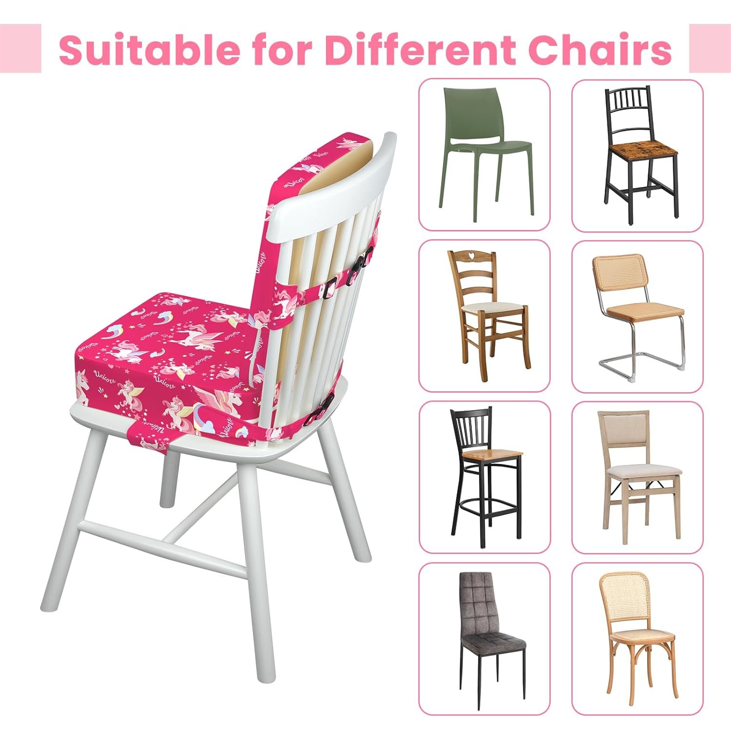 Toddler Booster Seat for Dining Table with Adjustable Straps, Kids Booster Seat for Kitchen Chair with Non-Slip Bottom, Portable Detachable Washable Increasing Cushion (Unicorn)