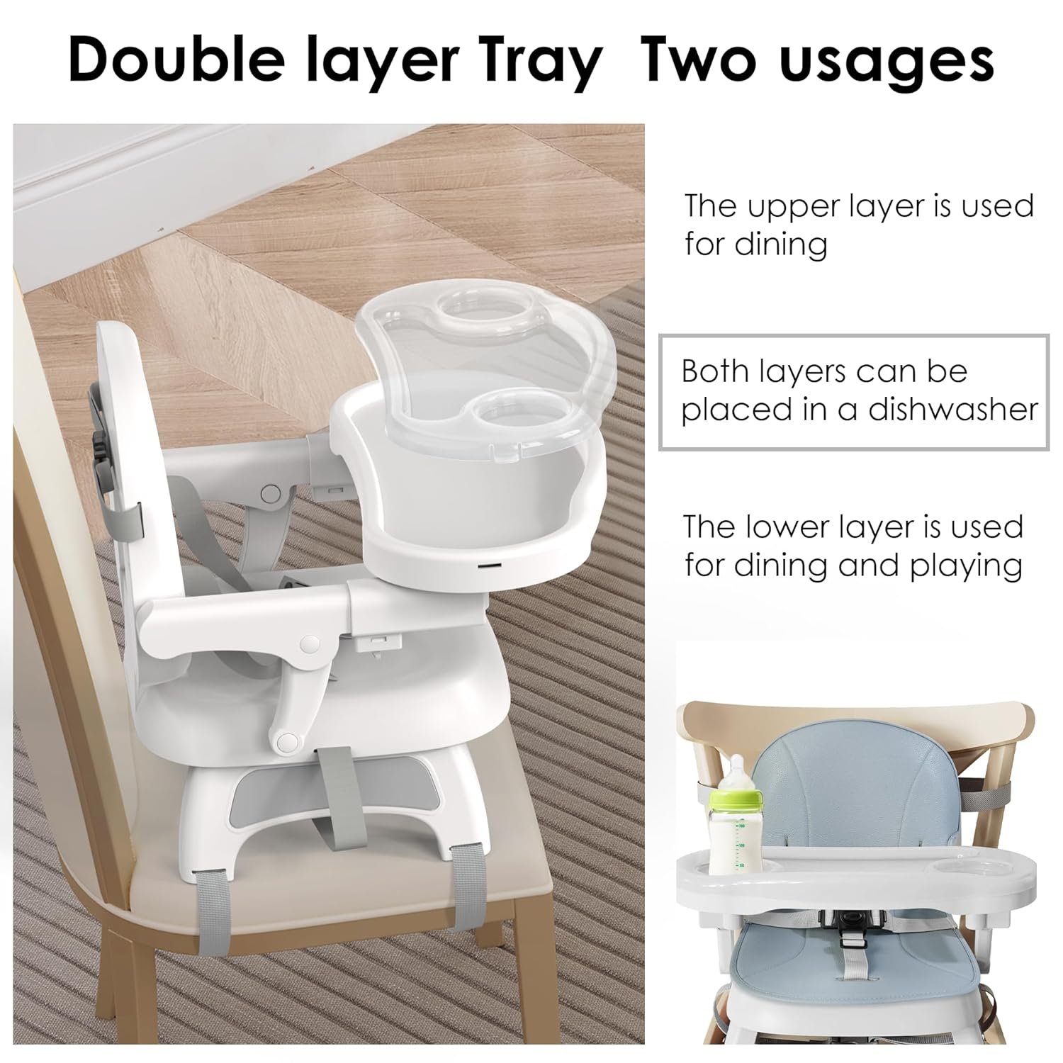 【Booster Seat with Tray】Double layer trays that is ideal for dinner and playtime and can easily be removed so baby can come closer to the table. Two trays are dishwasher safe which makes clean-up a cinch. With 3 distance to adjust,more space for your toddler.