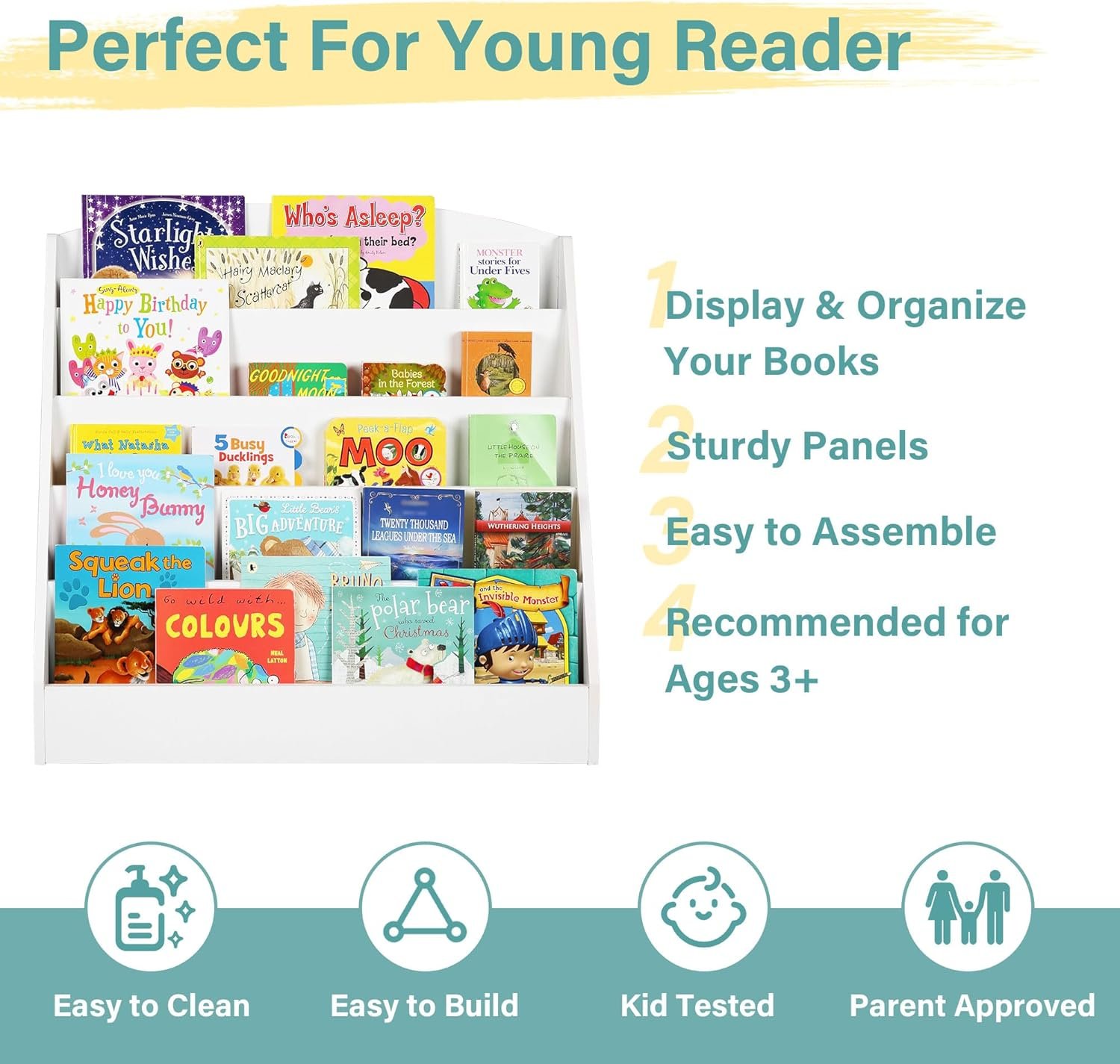 【EASY TO ASSEMBLE & CLEAN】- This kids bookshelf and toy storage comes with complete accessories and a user manual for quick assembly. And all boards are labeled to save your time and effort. Moreover, the smooth surface of the kids book shelf is easy to maintain and can be wiped clean with a damp cloth.🧹🎉