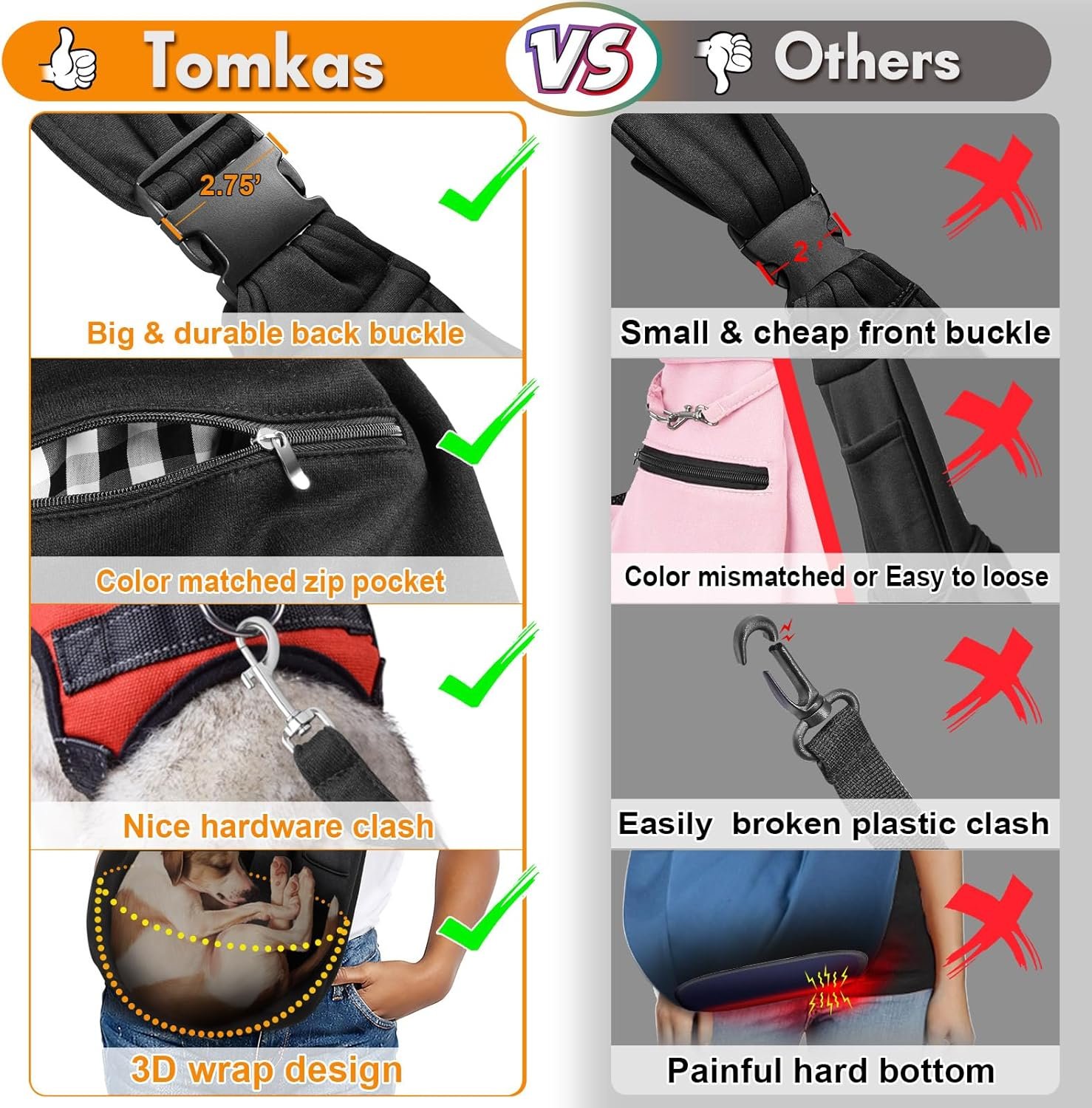 Size: The TOMKAS dog carry bag is best suited for pets weighing between 3-10 lbs, with a high capacity of 10 lbs. Our adjustable shoulder strap includes a sturdy plastic buckle for easy length adjustments. The TOMKAS dog sling’s shoulder strap adjustment buckle is larger and stronger than other similar products, making it easy to use for both adults and children.