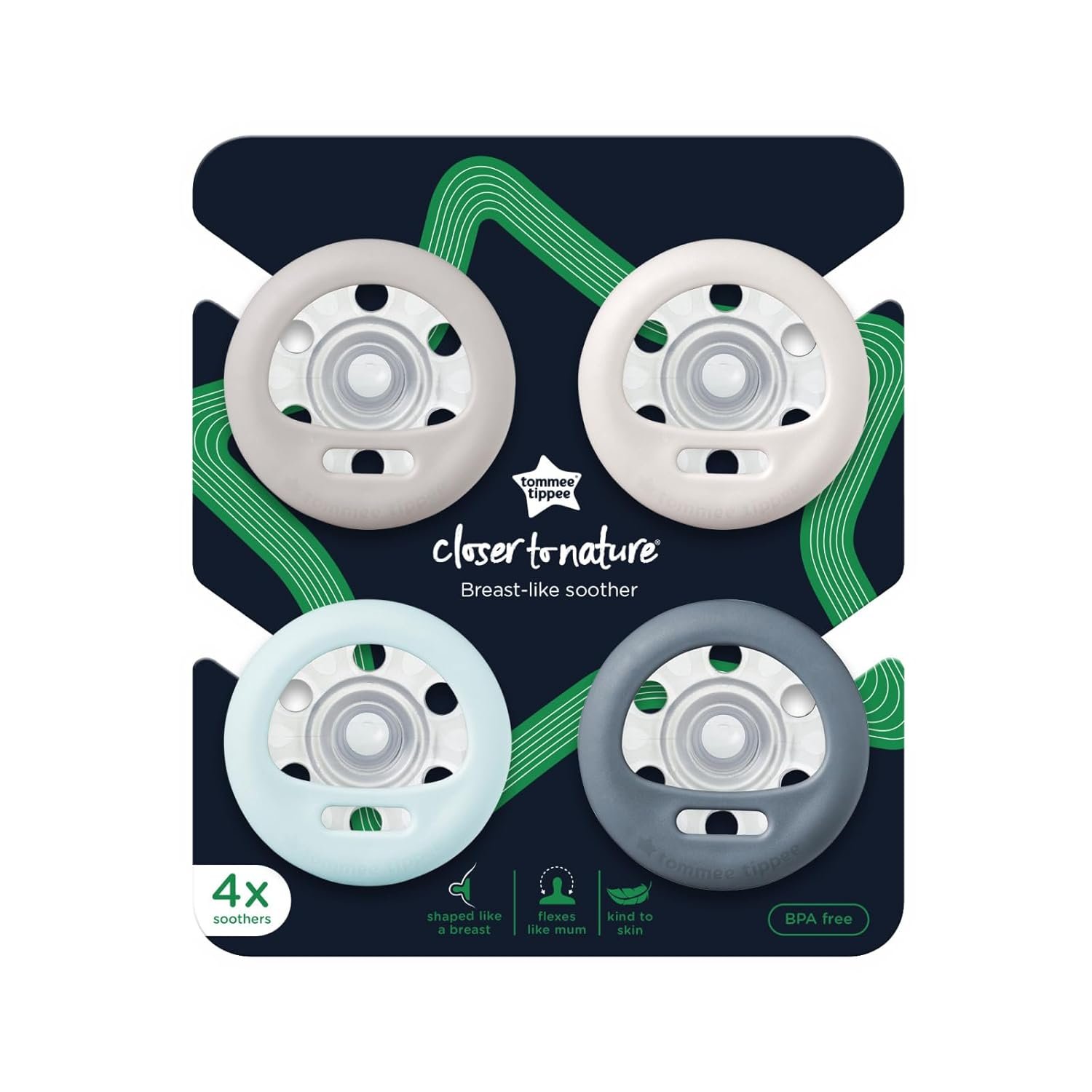 Tommee Tippee Breast-Like Pacifier, 0-6 Months, Symmetrical Design, Natural Breast-Like Baglet, BPA-Free Binkies, Pastel/Blue/Black, Pack of 4
