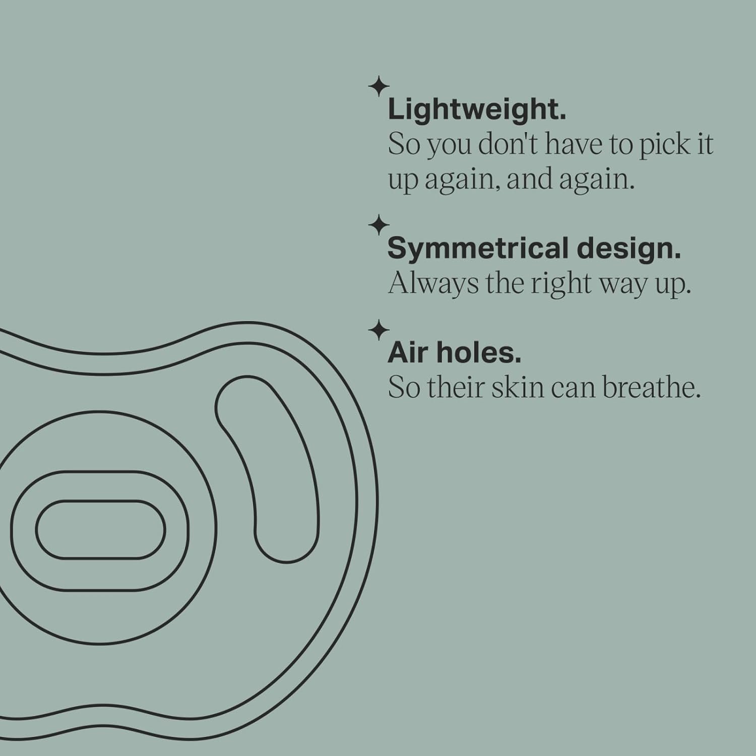 The lightweight pacifier that stays put in their mouth, so you don’t have to pick it up again and again (and again). • The lightest one-piece silicone pacifier* • Symmetrical silicone nipple (so it always sits the right way up) • Air holes so their skin can breathe • 100% BPA free, medical grade silicone • Available in 3 age stages: 0-6, 6-18, and 18- 36 months *Assessed on readable retail sales accounting for 98% of UK soothers category and 95% of US pacifier category (0-6m size), Nov 2023.