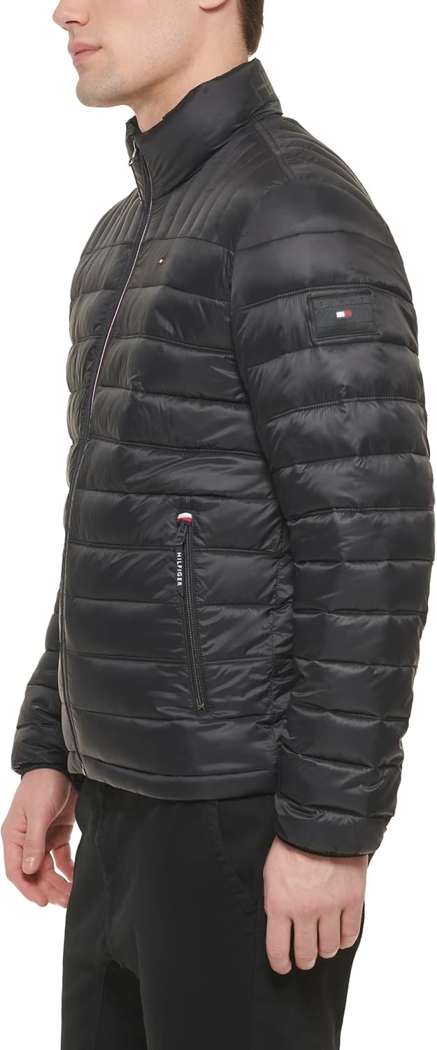 Logo packable in nylon with nylon lining, ultra loft fill, center front zipper closure, stand collar, Hilfiger on back of collar, drawstring at hem, elastic cuffs, and how to pack screen-print on interior lining, and two lower welt pockets.