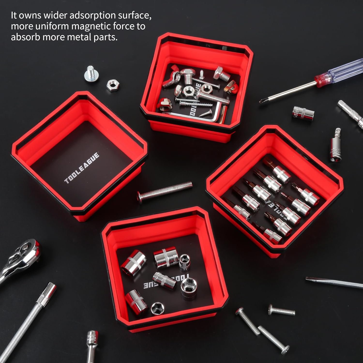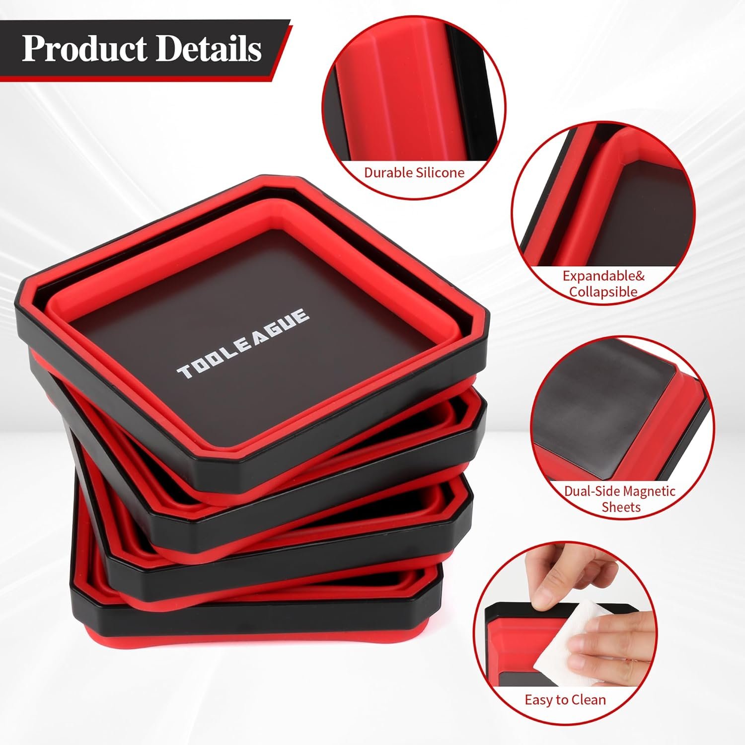 TOOLEAGUE 4Pcs Collapsible Magnetic Parts Tray Set with 15Lb Magnetic Pickup Pen,4.5″ Square Silicone Foldable Tool for Organizing Screw Bolts Nuts Washers Pins and Other Small Metal Parts