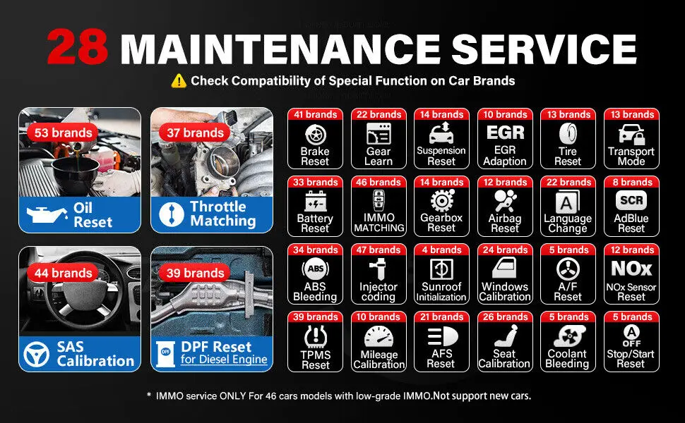 – 28 Maintenance Services: for most modern cars, and the car brand coverage is still growing in this scan tool.