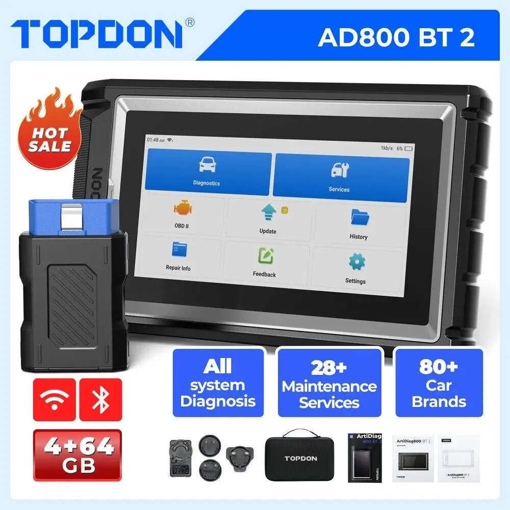 OBD2 Scanner Wireless, TOPDON AD800BT 2, 2 Years Free Update, Scan Tool, Automotive Diagnostic Tool, Full System Diagnosis, 28+ Reset Services, Oil Reset/ABS Bleeding/IMMO/TPMS/SAS/BMS/EPB/DPF/AutoVIN