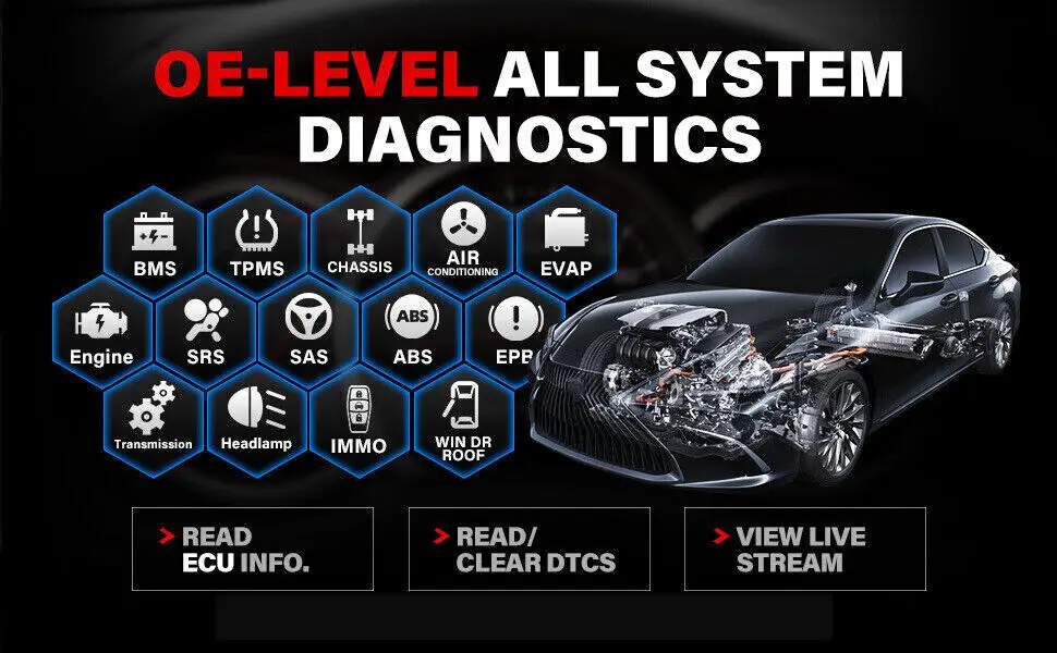 – All Available System Diagnostics: This full system diagnostic scanner covers 96 car brands worldwide to diagnose systems as Engine, Transmission, SRS, ABS, ESP, TPMS, IMMO, Gateway, Steering, Radio, Air Conditioning, and more. Retrieve E*CU Information; Read/Clear DTCs; Display Live Data Stream.