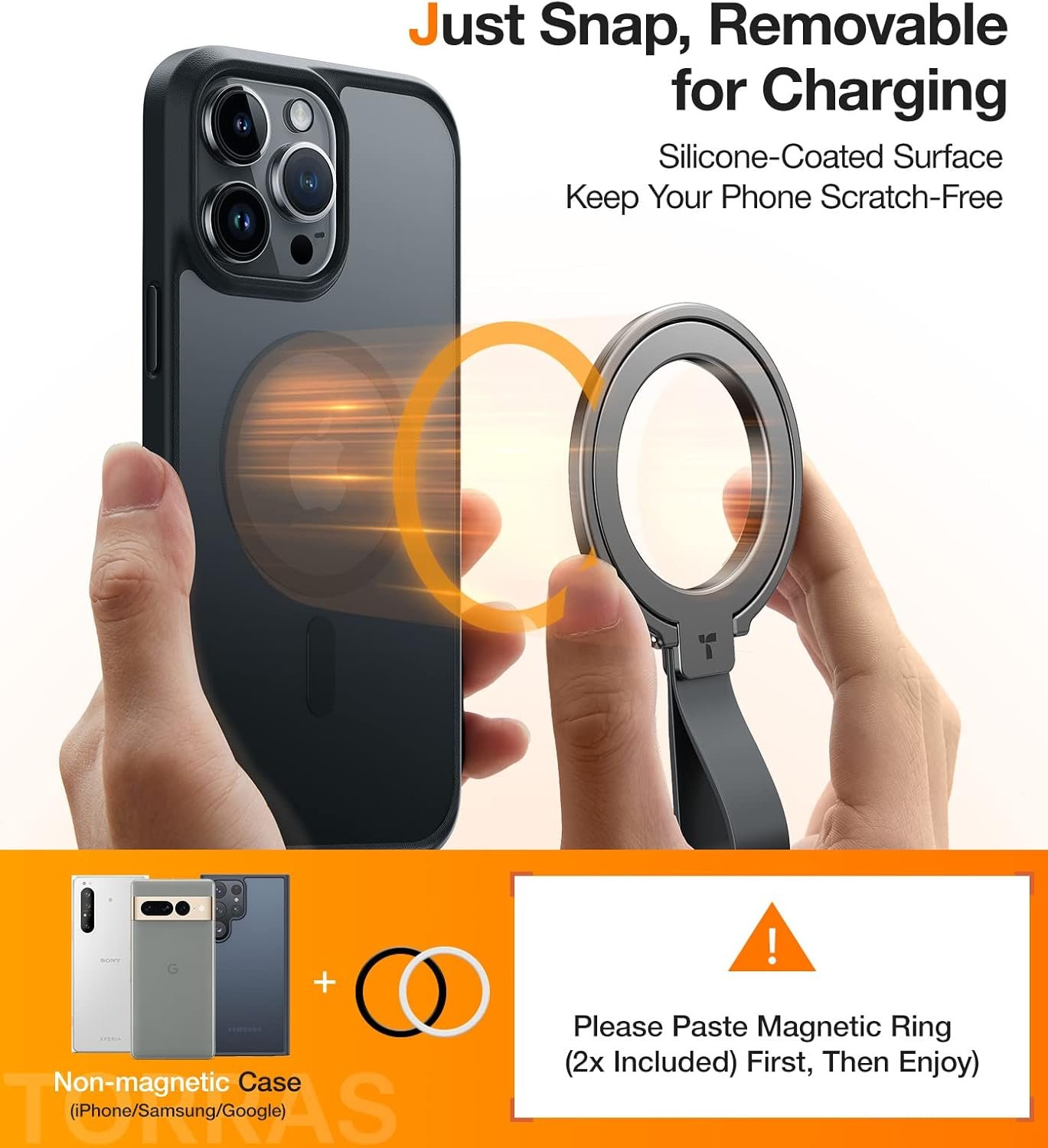 Magnetic Ring *2 Included, 180-Day Care: Only if you use the MAGNETIC CASE, TORRAS Ostand Ring Magnetic Holder works as a stand or phone grip holder, matches perfectly for iphone 14/13/12/11/XR/SE or more, Samsung Galaxy,or Google Pixel Phones. If you do not own magnetic case for your phone, just use the magnetic ring (2 included) before you use the magsafe-compatible phone grip, holder