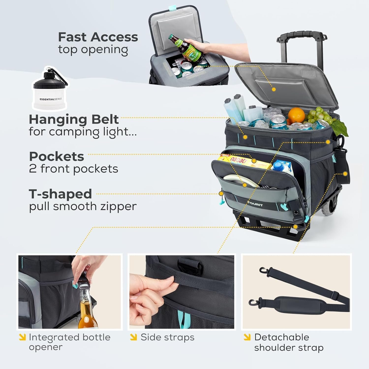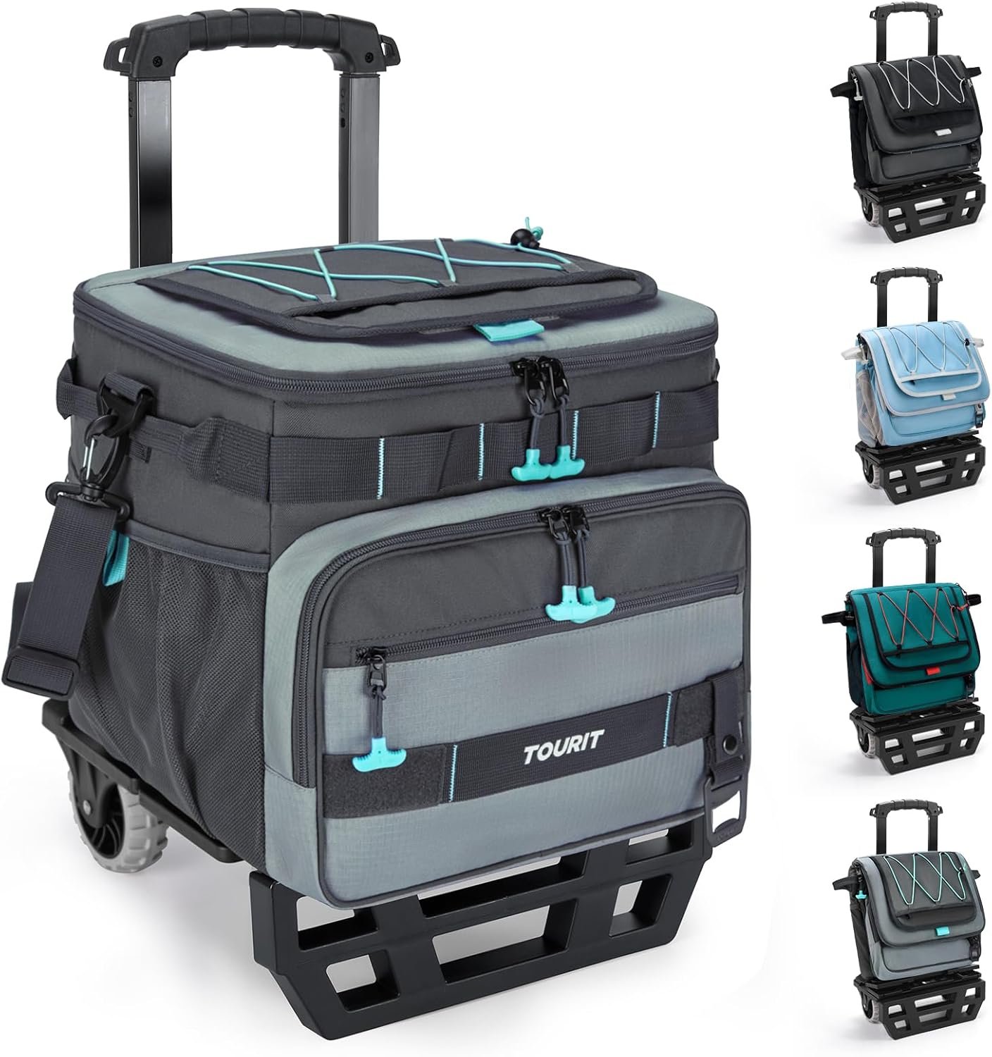 TOURIT Wheeled Cooler: Wheeled cooler features an insulated front compartment and an easy-access lid for quick access to food and beverages; Keeps ice for up to three days and holds up to 48 cans