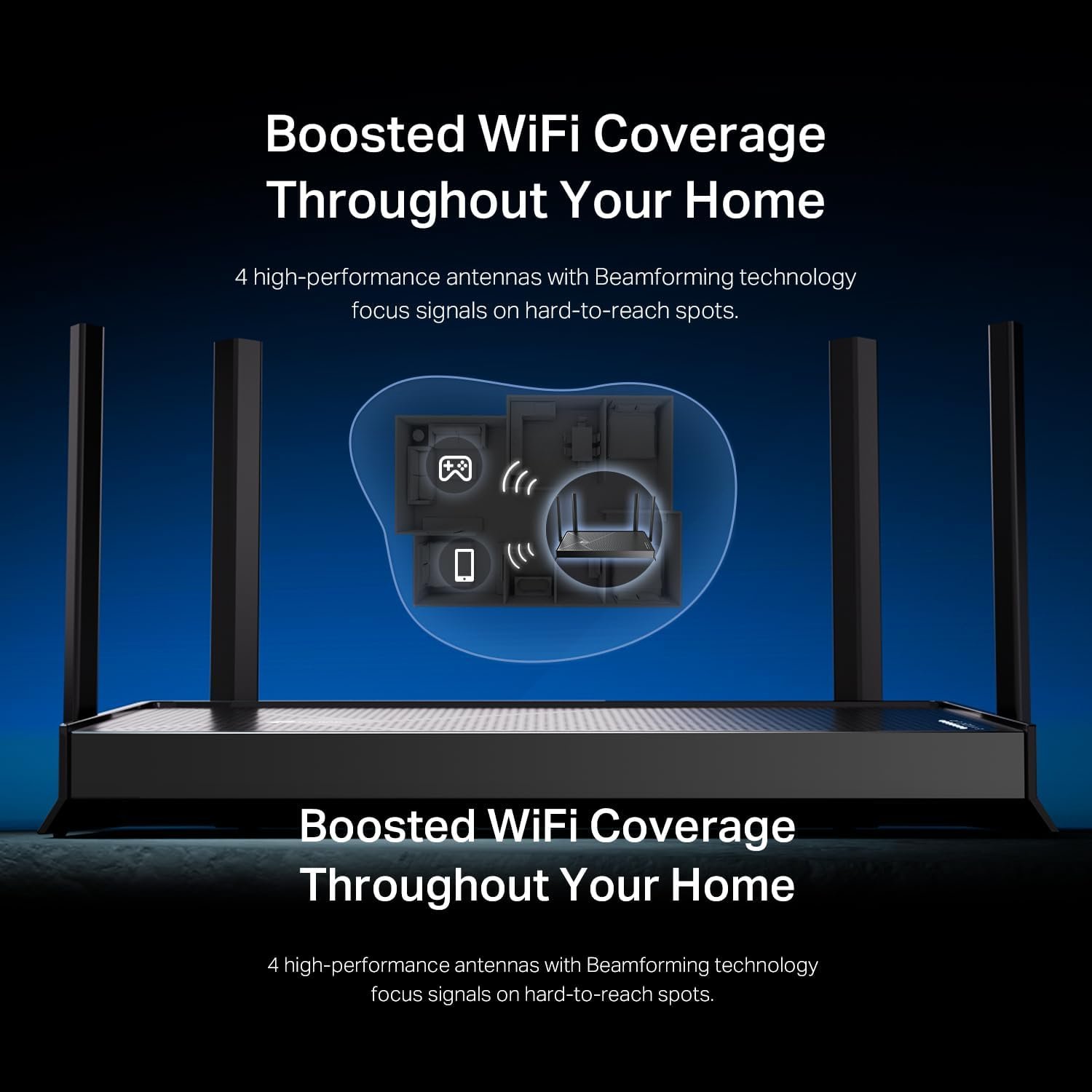𝐄𝐧𝐡𝐚𝐧𝐜𝐞𝐝 𝐂𝐨𝐯𝐞𝐫𝐚𝐠𝐞 𝐰𝐢𝐭𝐡 𝐅𝐨𝐮𝐫 𝐇𝐢𝐠𝐡-𝐏𝐞𝐫𝐟𝐨𝐫𝐦𝐚𝐧𝐜𝐞 𝐀𝐧𝐭𝐞𝐧𝐧𝐚𝐬: Four external antennas boost your Wi-Fi signal, while beamforming technology intelligently targets devices. Enjoy strong and reliable connections, even in hard-to-reach areas of your home.