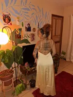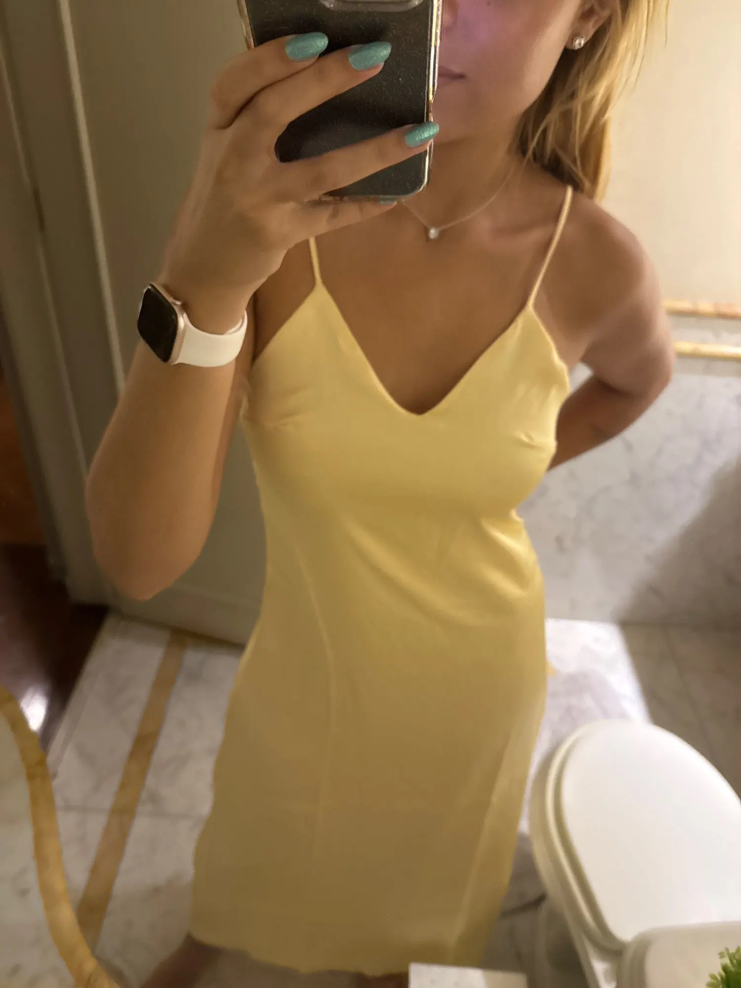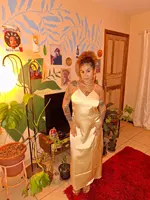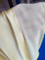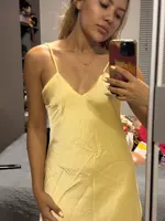 The size will only fit exactly for O. H.86 – 88cm. and that’s the maximum. At the waist and hips, it fits both size M and slightly larger. But in the chest it’s very small and besides everything, the straps that are adjustable on the shoulders are there, but those on the back are not and they don’t stretch. The problem is that these straps are sewn from exactly the same fabric and can only be replaced with the same fabric. My height is 1m60cm, the dress fits me snugly, and I can slightly shorten the length of the dress and use this fabric to make new, longer straps. But even with this option, the front panel of the dress will not be enough to cover the front if the bust size is more than 90-92 cm. The actual color of the dress is not yellow like in the seller’s photo, but rather a powdery yellowish pink, and all seams have a pinkish tint to them, which I do not like. . The zipper wrinkles slightly. Dress with yellow silk lining. The fabric itself, if it were yellow or at least didn’t have a pinkish tint on the seams, would be good, flowing, and pleasant.