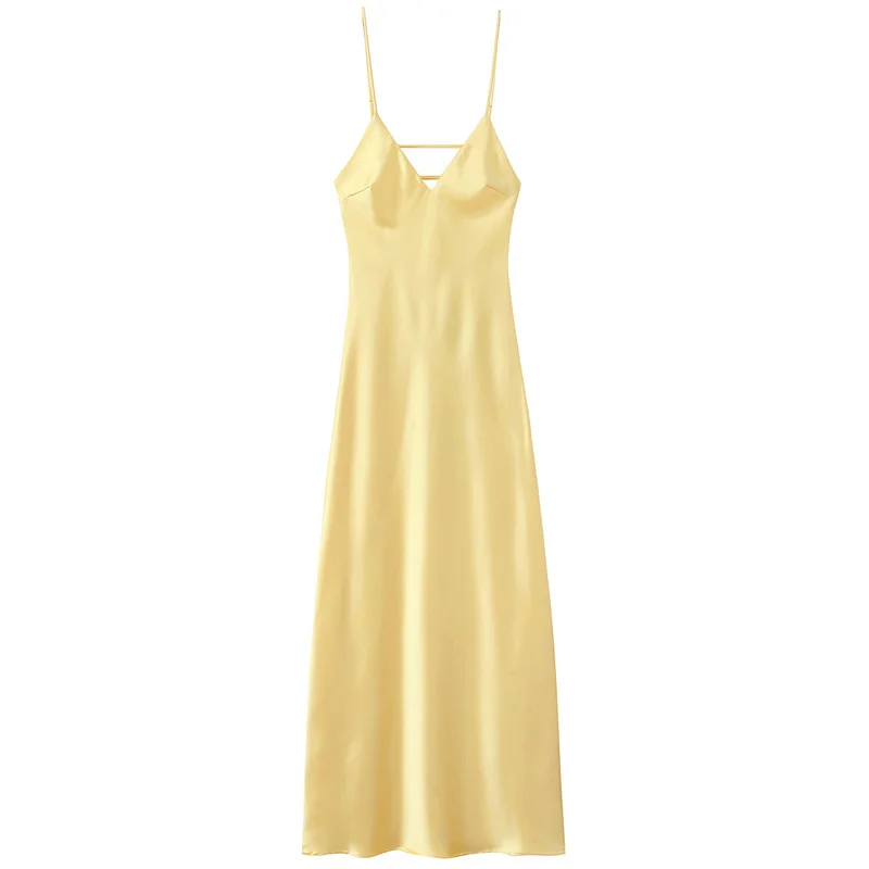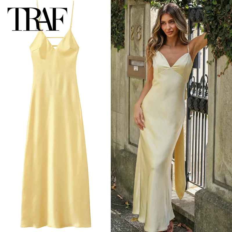 TRAF Womens Yellow Slip Dress Summer 2025 Woman Satin V-Neck Party Dresses Elegant Evening Sleeveless Backless Long Vestidos 066