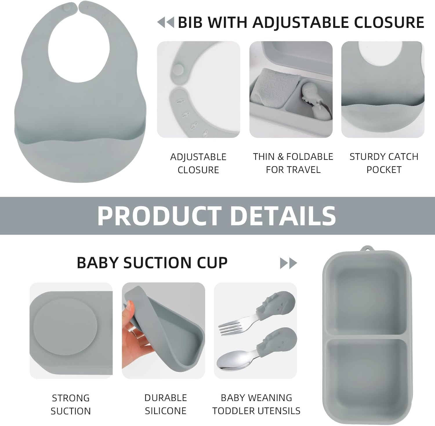 Travel Silicone Baby Feeding Set with 316 Stainless Steel Spoon & Fork,Silicone Suction Plates, Foldable Bib, Storage Bag – Portable Infant Toddler Utensils, 6-Piece BPA-Free Dishware Kit(gray)