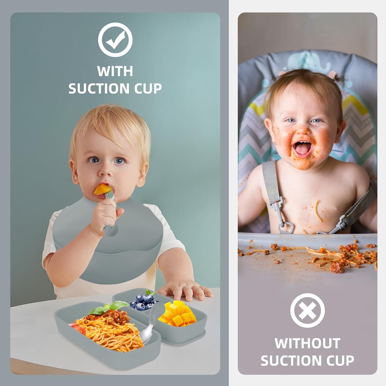 【Strong Suction Base & Anti-Spill Design】Silicone suction plates stick firmly to tables, preventing messy spills. Ideal for active toddlers learning self-feeding.