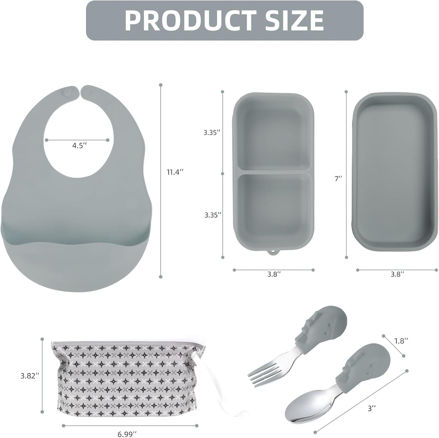 【Complete 6-Piece Feeding Kit】Includes two silicone dinner plates with suction cups on the bottom, a 316 stainless steel fork and 316 stainless steel spoon, a foldable bib and a waterproof storage bag.