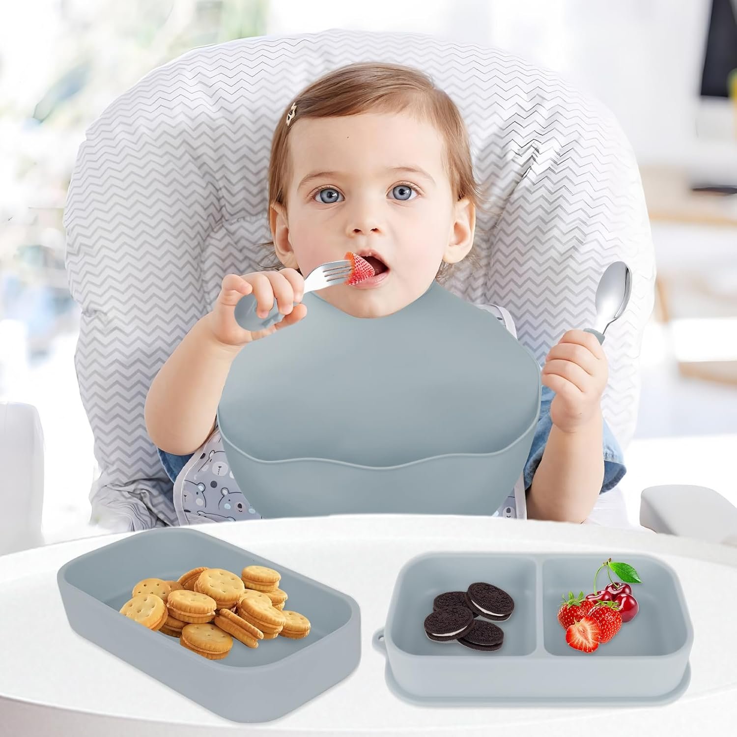 【Developmentally appropriate design】 A divider silicone dinner plate with soft edges and an ergonomic spoon and fork encourage your baby over 6 months to independently practice grip strength and hand-eye coordination.