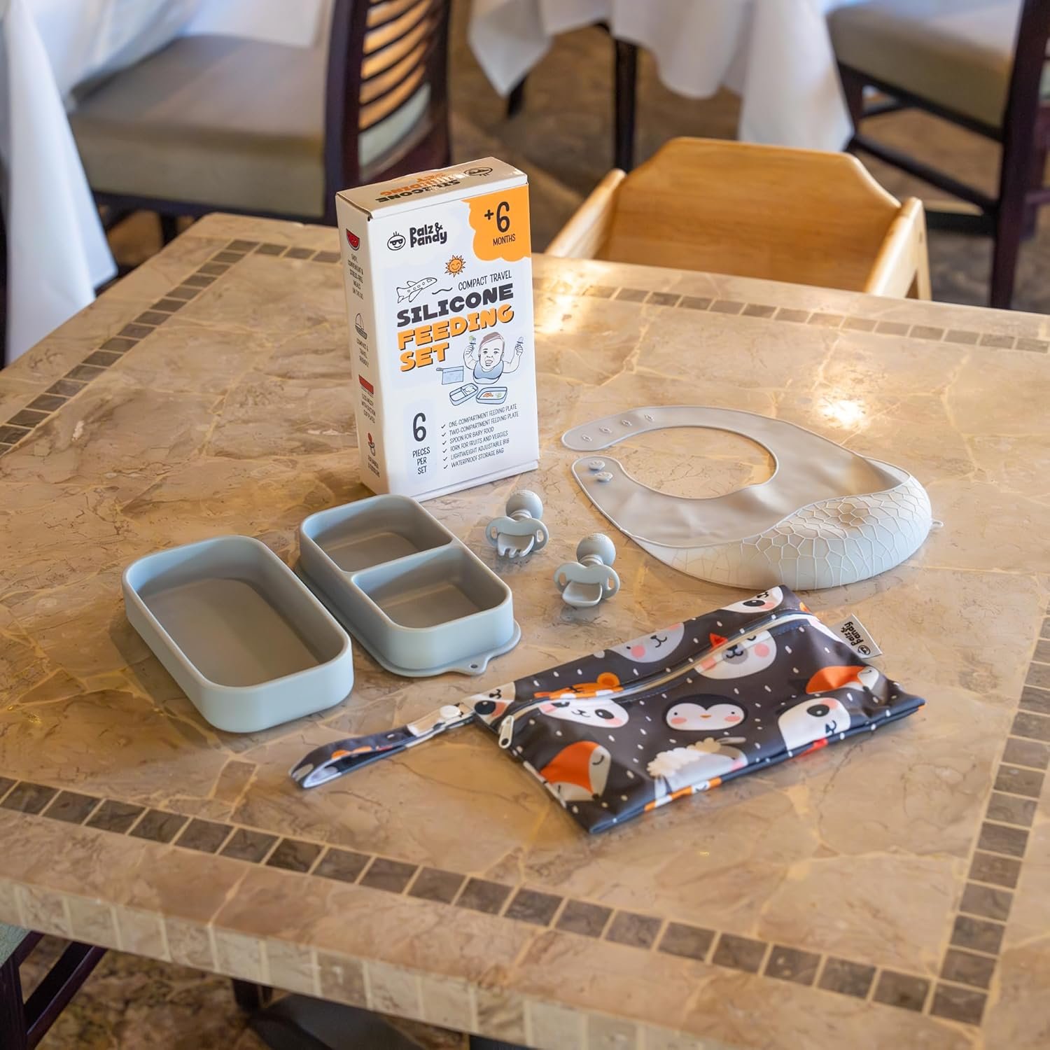 The Only Thing Not Included Is the Food: Seriously, our travel baby eating set comes with all of the essentials: 2 Travel Plates for Toddlers with Suction (Regular and Divided), Lightweight, Foldable Silicone Bib, Baby Self Feeding Spoon and Fork, and an Adorable Waterproof Storage Bag