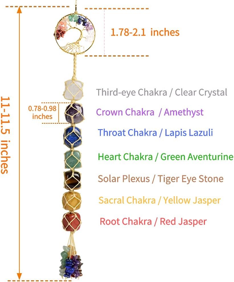 [7 Chakras Healing Crystals]: Clear Crystal Quartz, Amethyst, Lapis Lazuli, Green aventurine, Tiger eye, Yellow Jasper, Red Agate. Tree of Life Size: 1.77 inches,Tumbled stones size: 0.7-0.98 inches, Chipped stones size: 5-8mm. Total Length: 11-11.5 inches