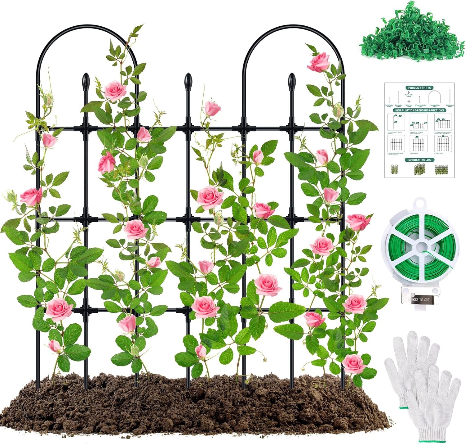 Coated Steel Pipes—— Our garden trellis for climbing plants is made of thickened steel tubes wrapped with PE coating,while ensuring stability and firmness, it can also be waterproof and rustproof.The three-way and four-way connecters are made of sturdy and lightweight plastic,easy to install.We also provide gloves,iron wire and 30pcs vine clips to fix the vines to your wanted shape.