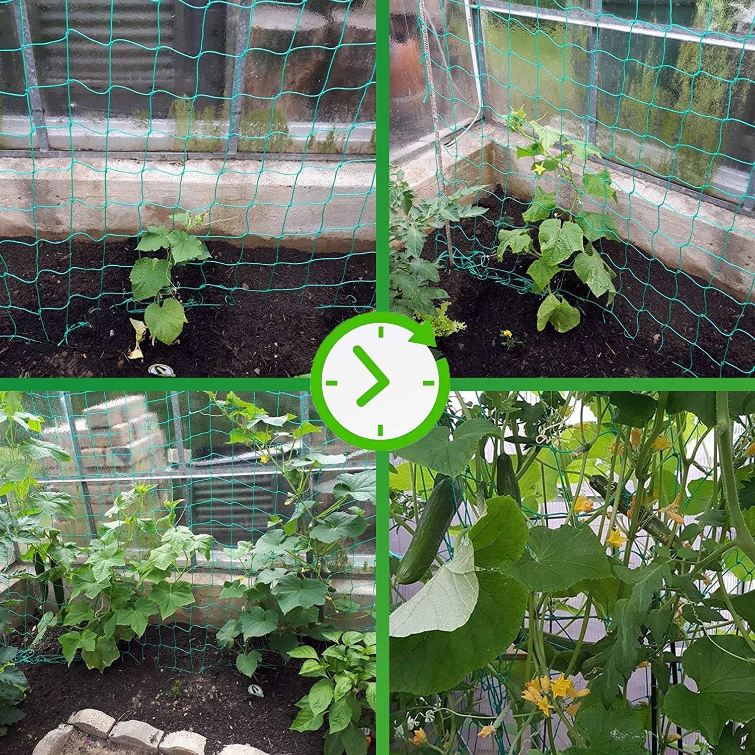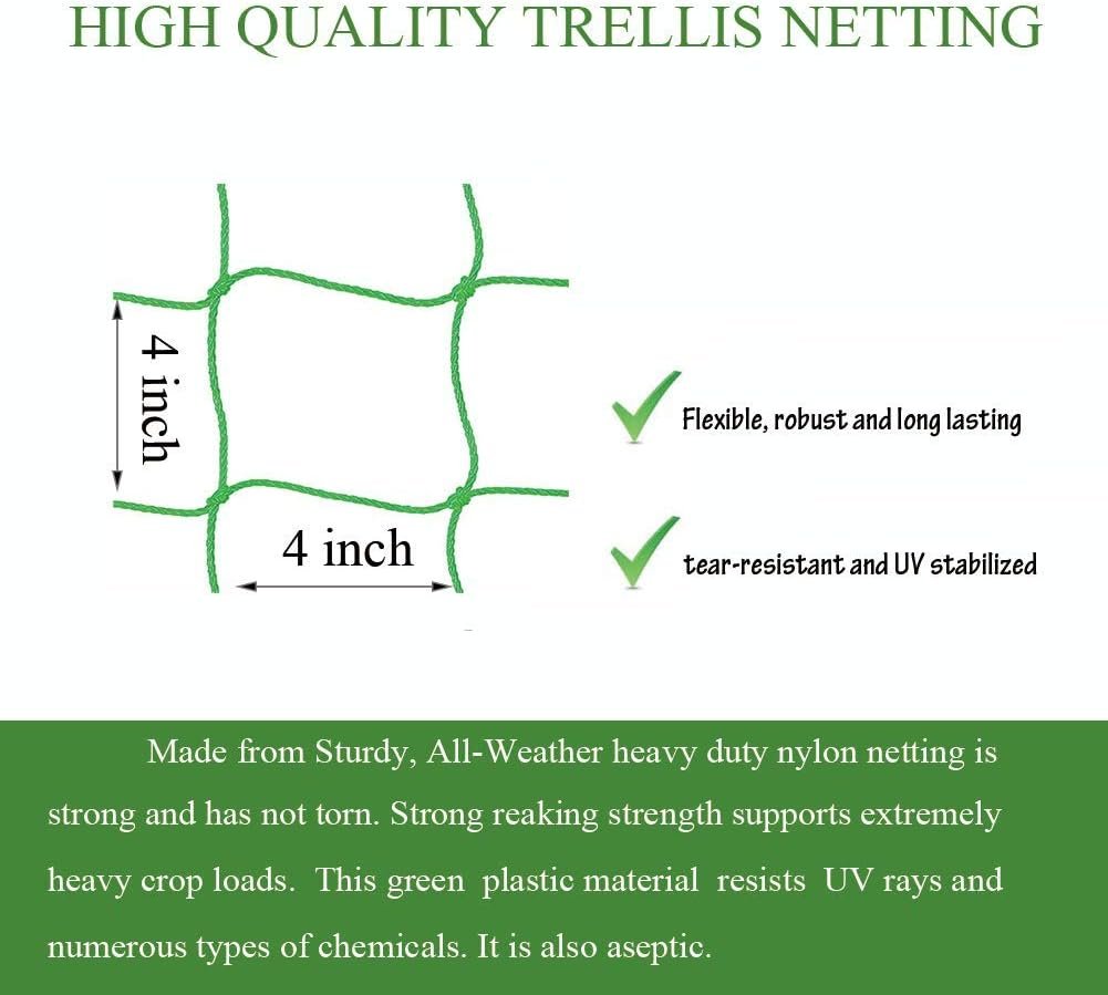 HIGH QUALITY: Made from Sturdy, All-Weather heavy duty nylon netting is strong and has not torn. Strong reaking strength supports extremely heavy crop loads. This green plastic material resists UV rays and numerous types of chemicals. It is also aseptic. You can reuse or recycle the netting after harvest. These features make it the most efficient and cost-effective way to support your climbing plants!