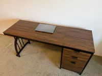 metal frame with a lavish brown wooden tabletop. This fusion of