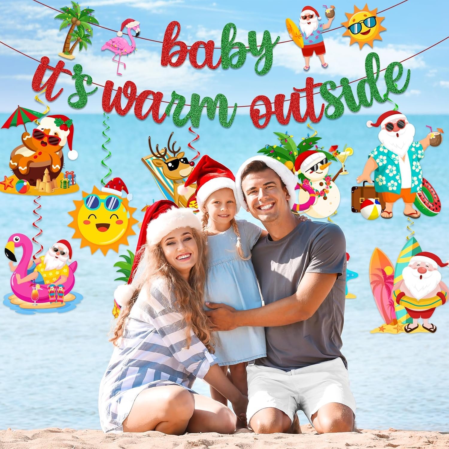 Tropical Christmas Decorations, Summer Christmas Decorations includes Glitter Baby Its Warm Outside Banner and Santa Hanging Swirls, for Hawaiian Luau Beach Theme Christmas Decorations