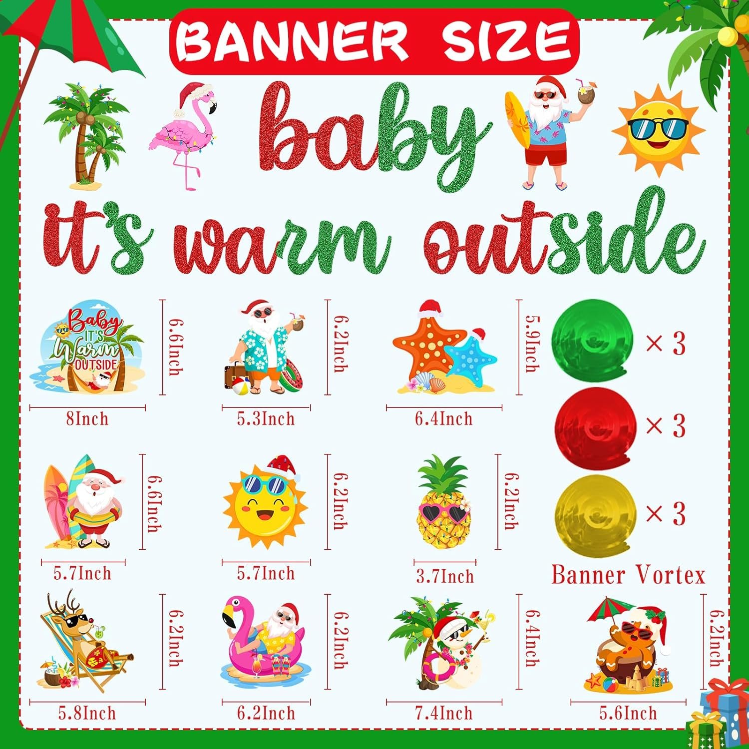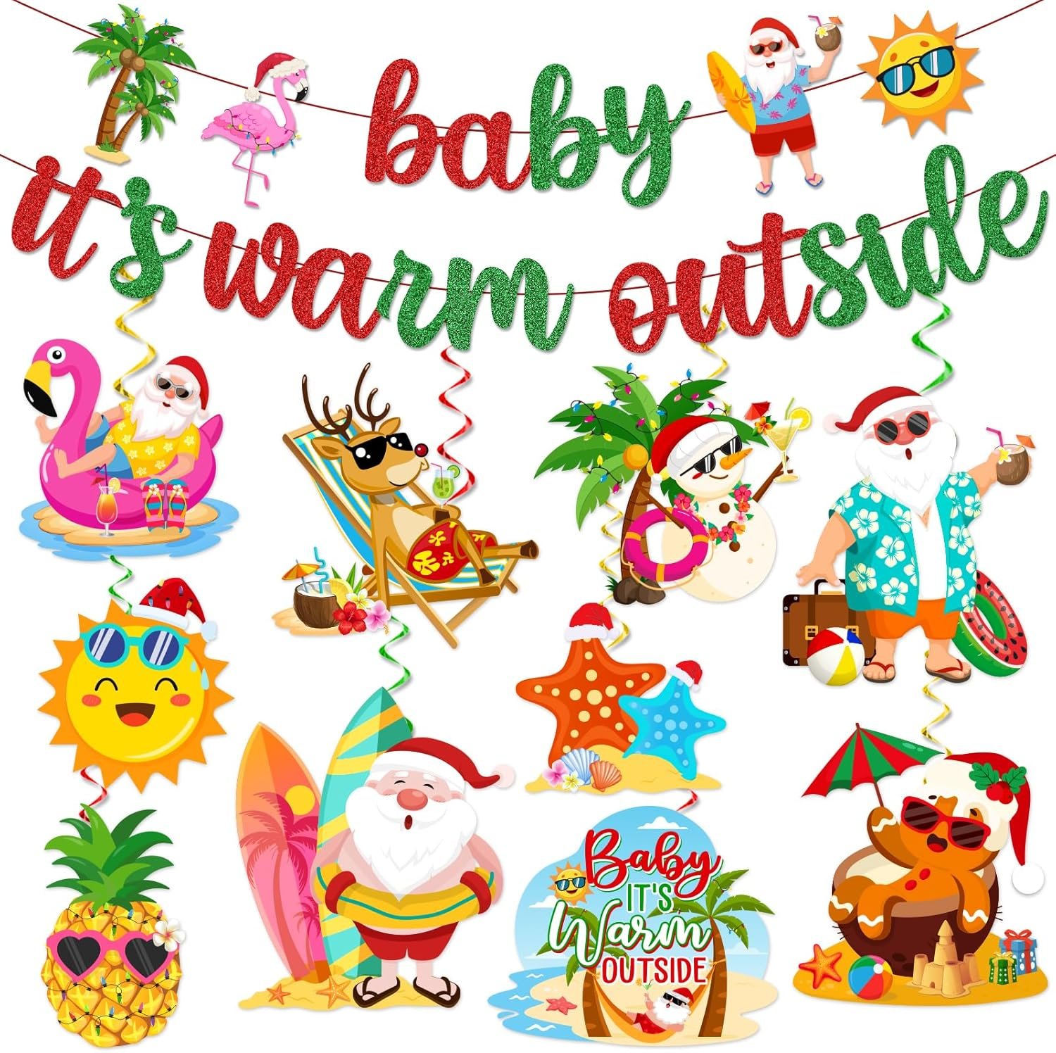 value package: our summer christmas decorations comes with 1 pc baby its warm outside banner, 10pc beach christmas decorations hanging swirls come with 10 pcs of different card cutouts in 10 different designs; 10 pcs whirls glitter foil ceiling swirls streams in red and green. the beach theme christmas decorations hanging swirls will be a big hit at your summer party and adding festival atmosphere by setting this colorful baby its warm outside decorations