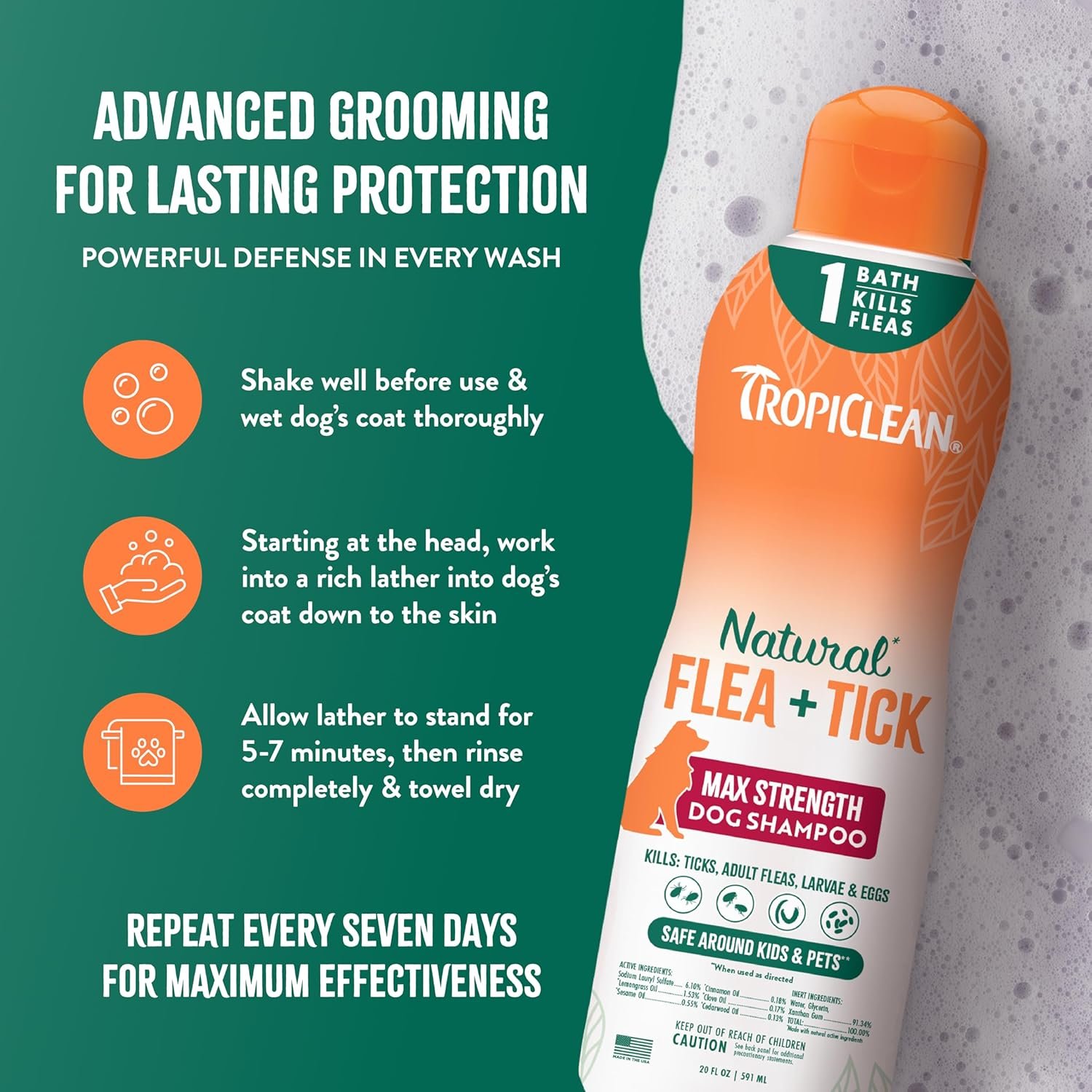 TropiClean Max Strength Flea and Tick Shampoo Treatment for Dogs, Powerful & Natural Defense, Prevention for Large & Small Dogs, Made in USA, 20oz