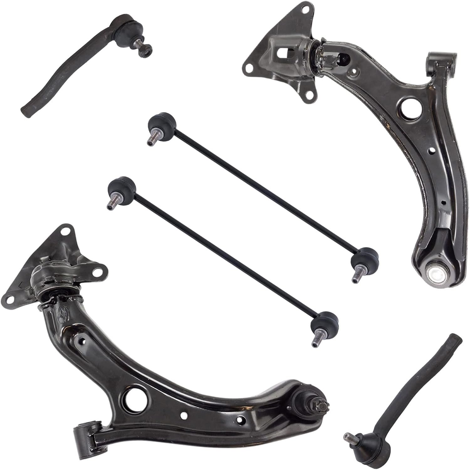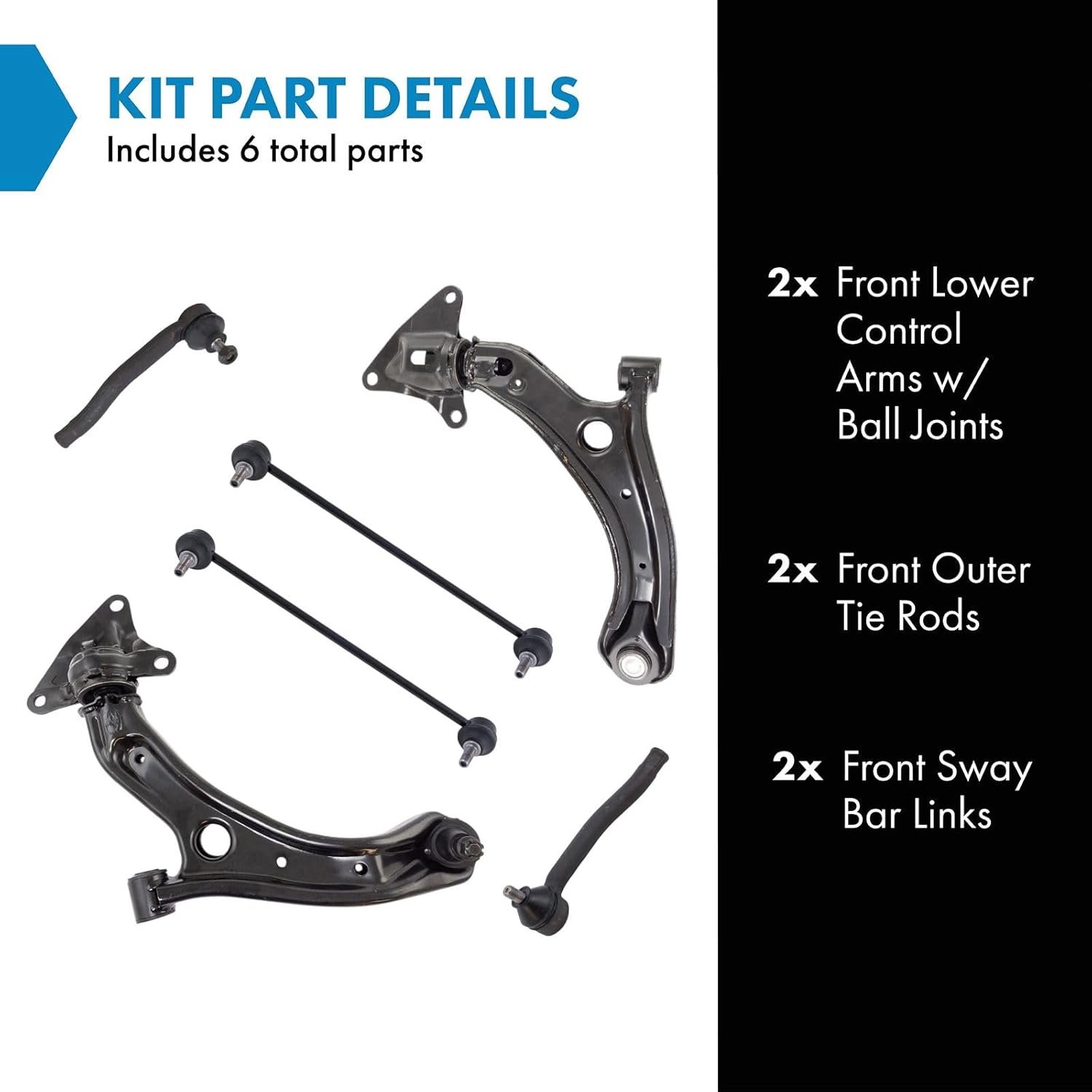 Kit Includes: (2) Front Lower Control Arms with Ball Joints; (2) Front Sway Bar Links; (2) Front Outer Tie Rods