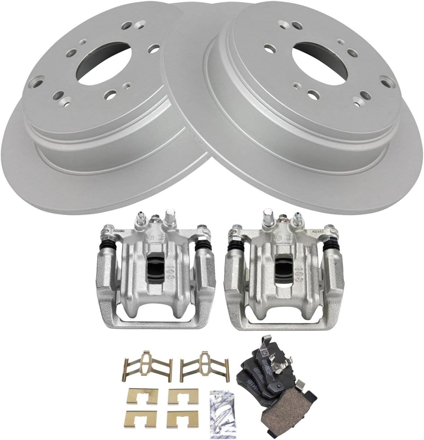 Kit Includes: (1) Rear Ceramic Brake Pad Set with Contact Point Grease & Hardware; (2) Rear G-Coated Brake Rotors; (2) Rear Brake Calipers with Hardware & Mounting Brackets