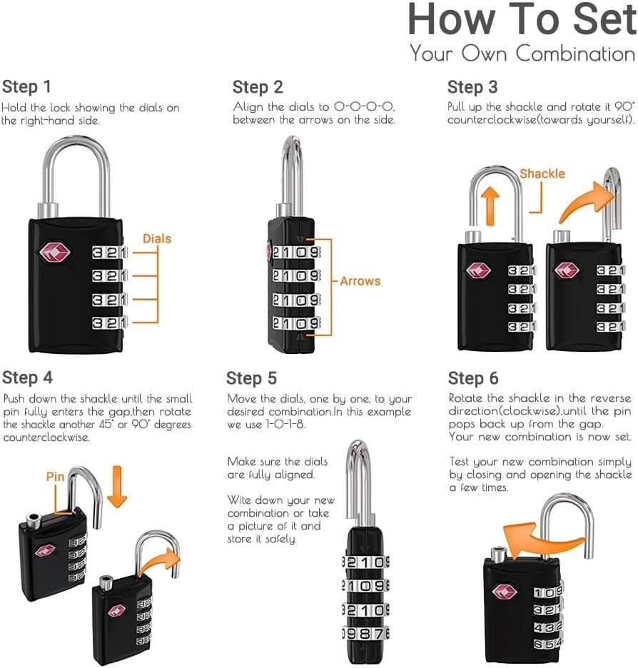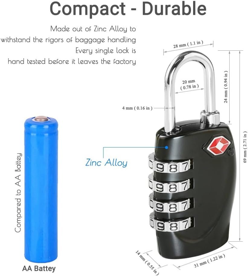 【Sturdy and Robust】The Zinc Alloy body of the lock and the hardened steel shackle are light and strong, designed to withstand the rigors of suitcase handling during your travel.
