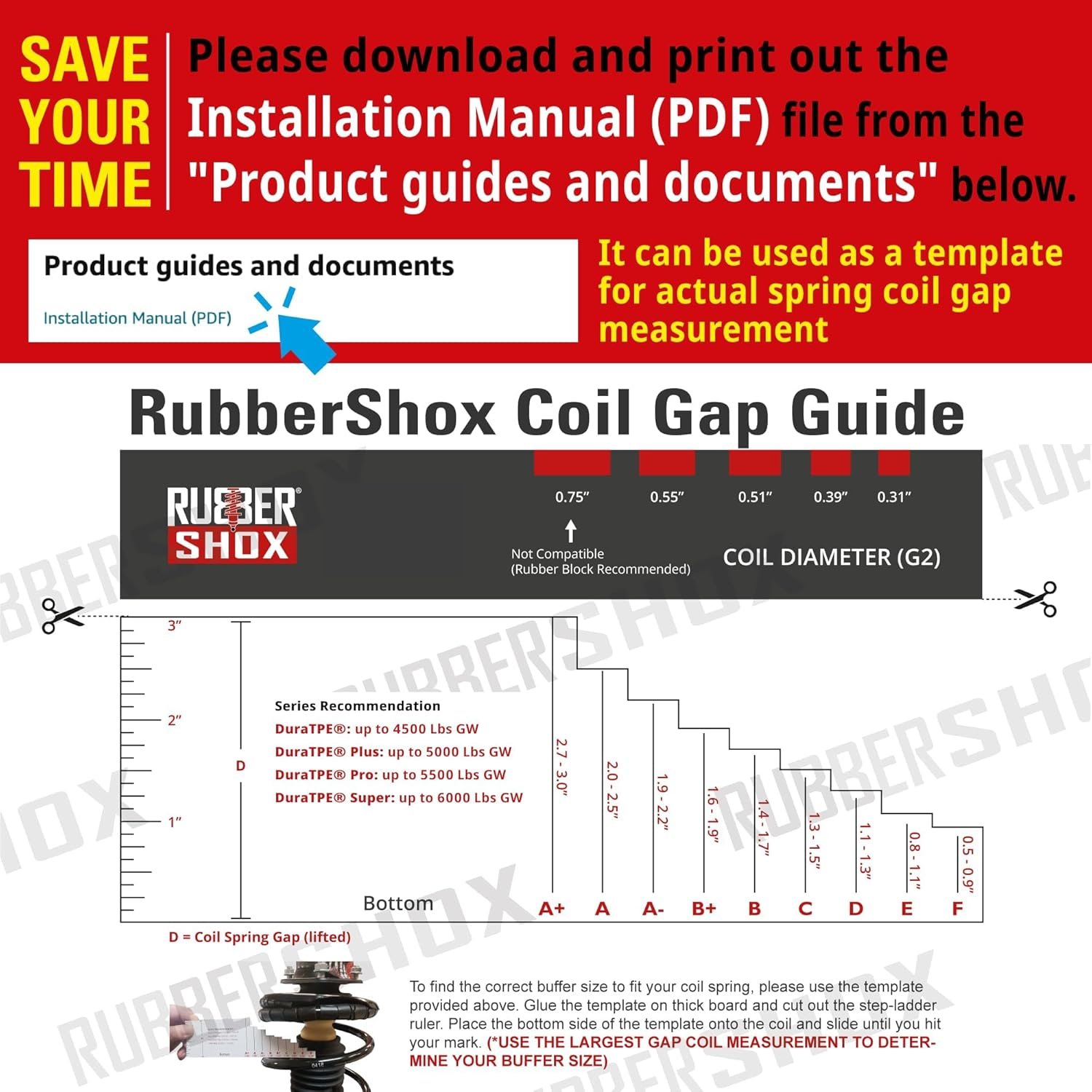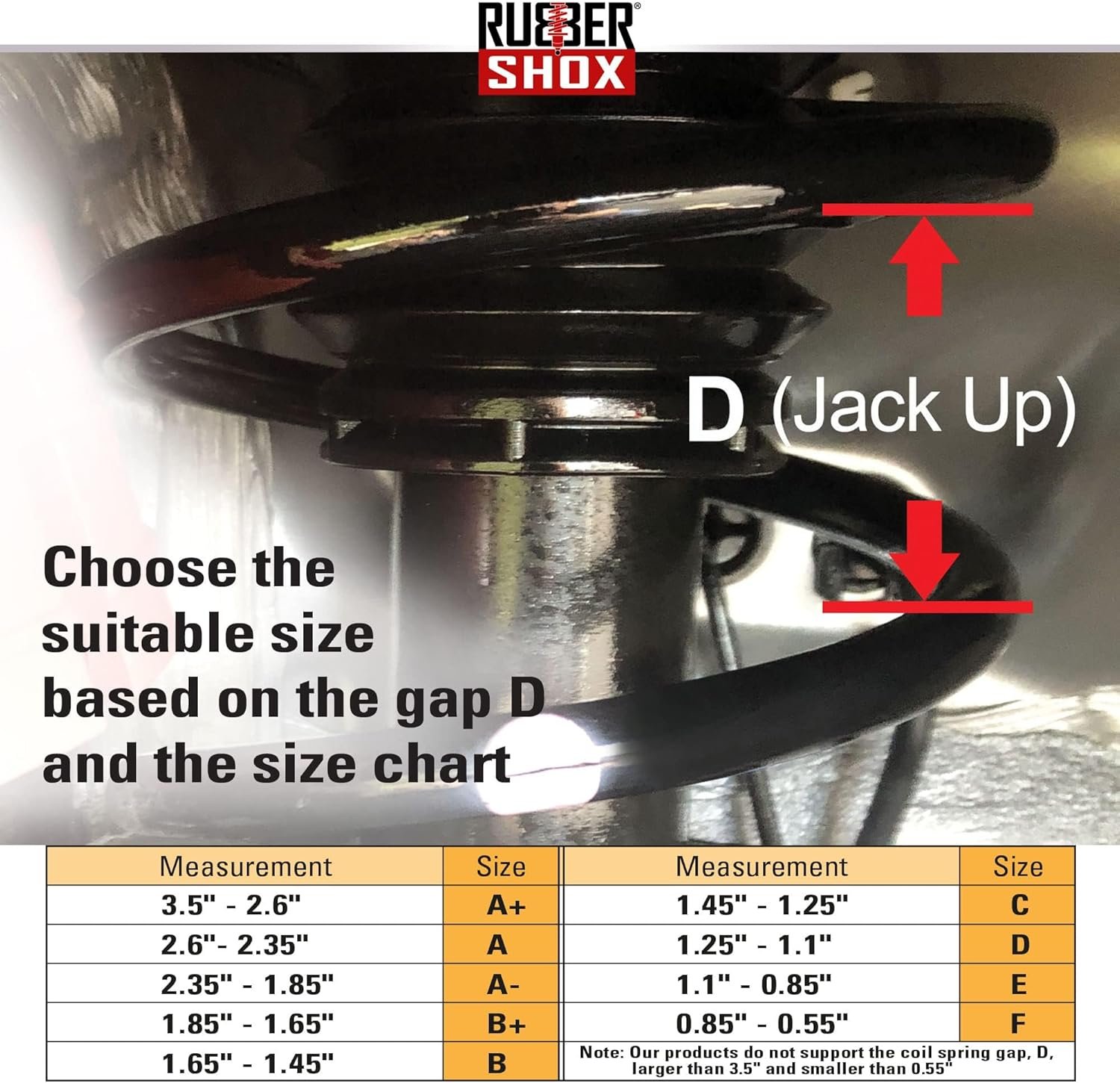 【Product Dimensions】:Choose Size A+ of the rubber buffer, if the Car Coil Spring Gap (when lifted and unloaded) is between 2.6”-3.5”. *Please lift the vehicle to measure the Gap. Coil gap may vary between brands and years of use. Also refer to Size Chart in Photos and User Manual in Technical Specification.