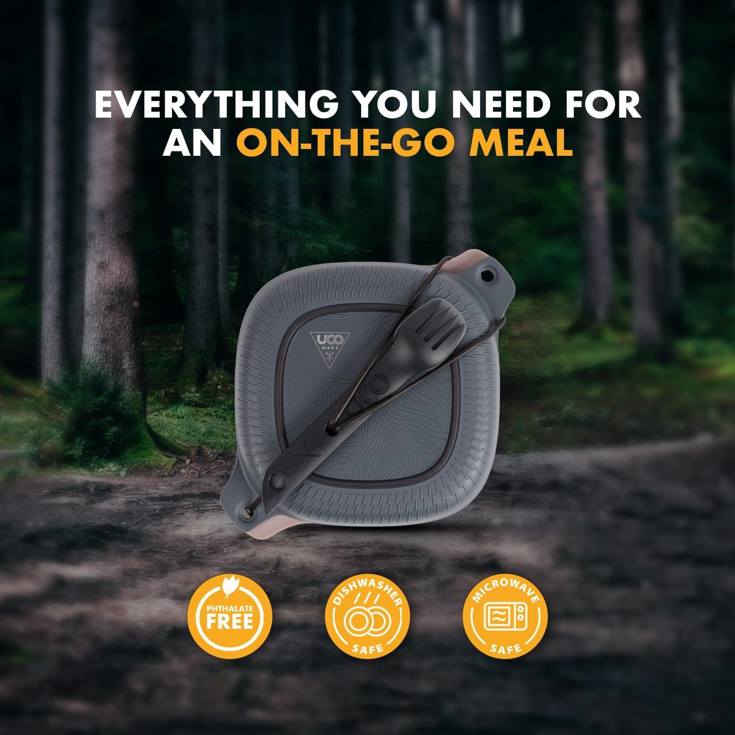 For meal storage and transport, the bowl and plate connect with an airtight seal; collapsible camp cup stows inside kit; included tether secures spork and keeps kit contents contained