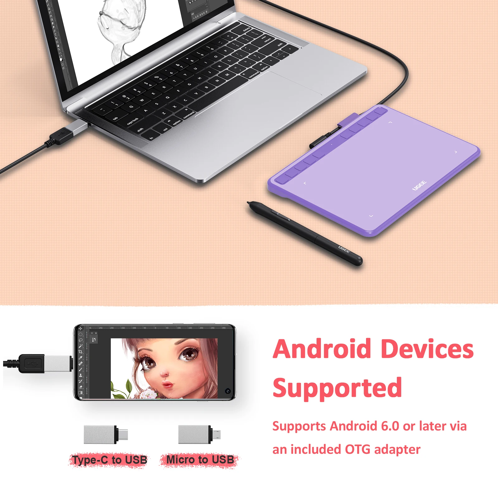 Ugee S640 portable drawing tablet in Black, Purple and Red is designed with a 6.5-inch size, ideal for digital drawing enthusiasts, designers, and students on a budget to use anywhere and anytime. Compatible with Android devices.