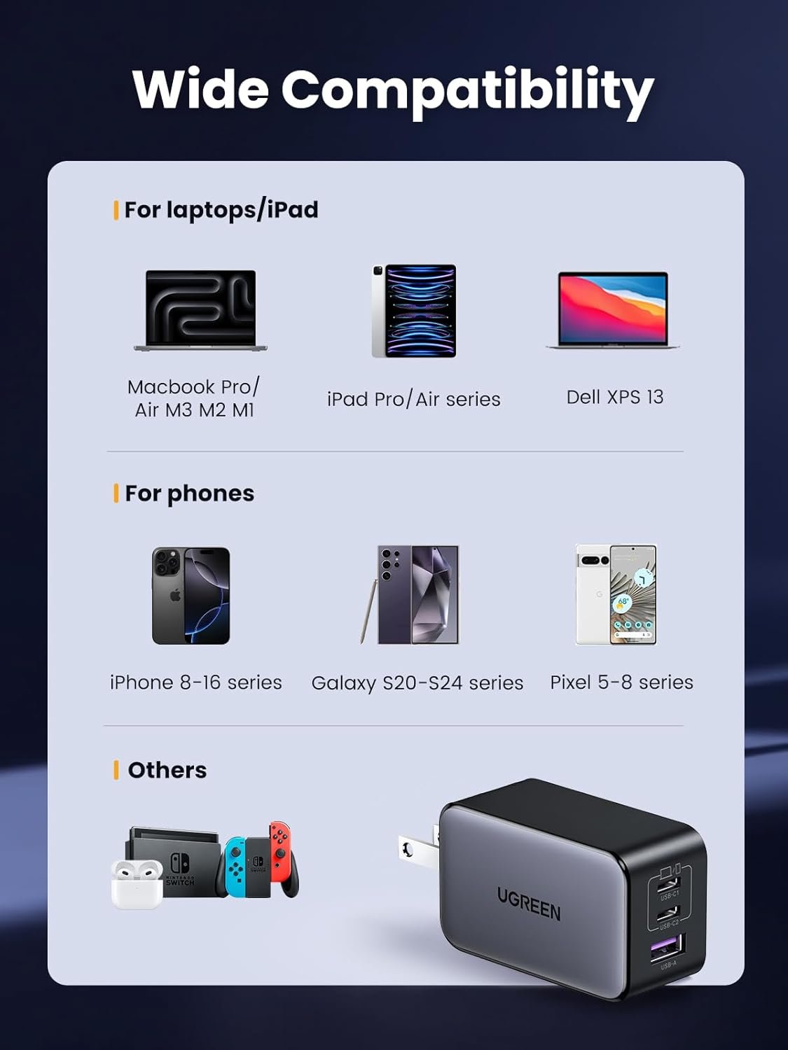 Travel Friendly, Compact Design: Thanks to a cutting edge GaN chip, Ugreen’s 65W USB C charger is 50% smaller than the original 61W USB C charger; A foldable plug provides more portability and a better travel experience