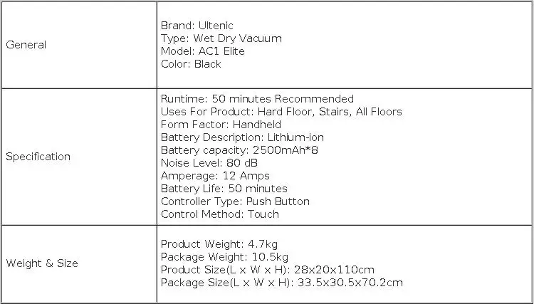 Ultenic Cordless Wet dry vacuum gives you the ability to vacuum, wash, and mop your floors at the same time. Quicker and easier to clean all types of messes. Pressing a single button initiates the self-cleaning cycle, eliminating the need to manually clean the messy brush rollers.