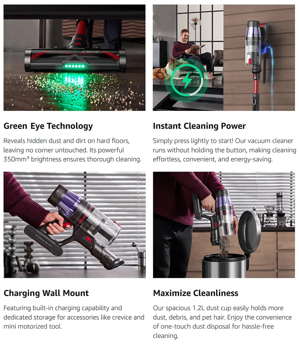 The roller brush incorporates green light technology to reveal dust that’s normally hard to see. This feature enhances cleaning precision, especially in low-light environments. Perfect for thorough cleaning under furniture and in corners, this cordless vacuum ensures no dirt goes unnoticed.