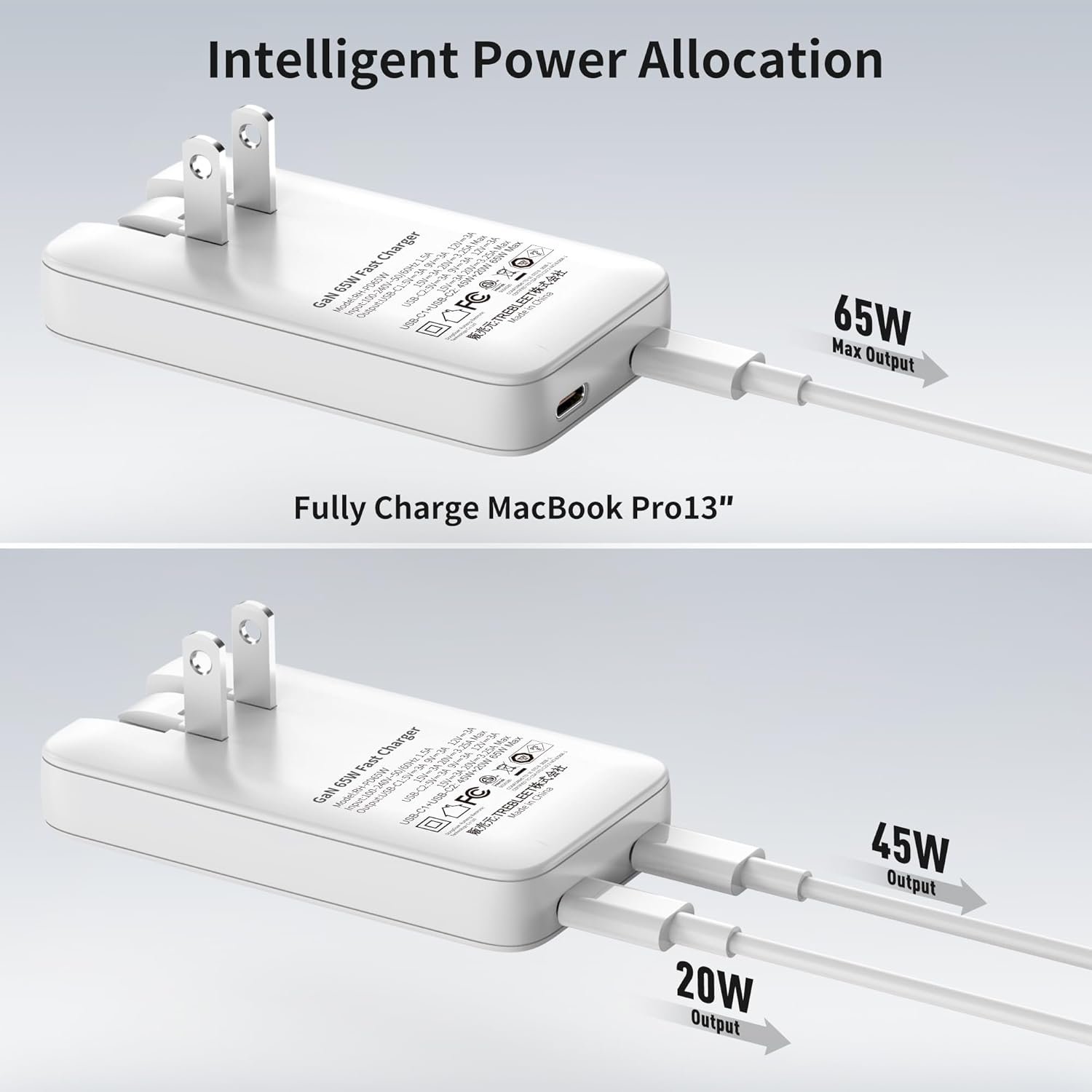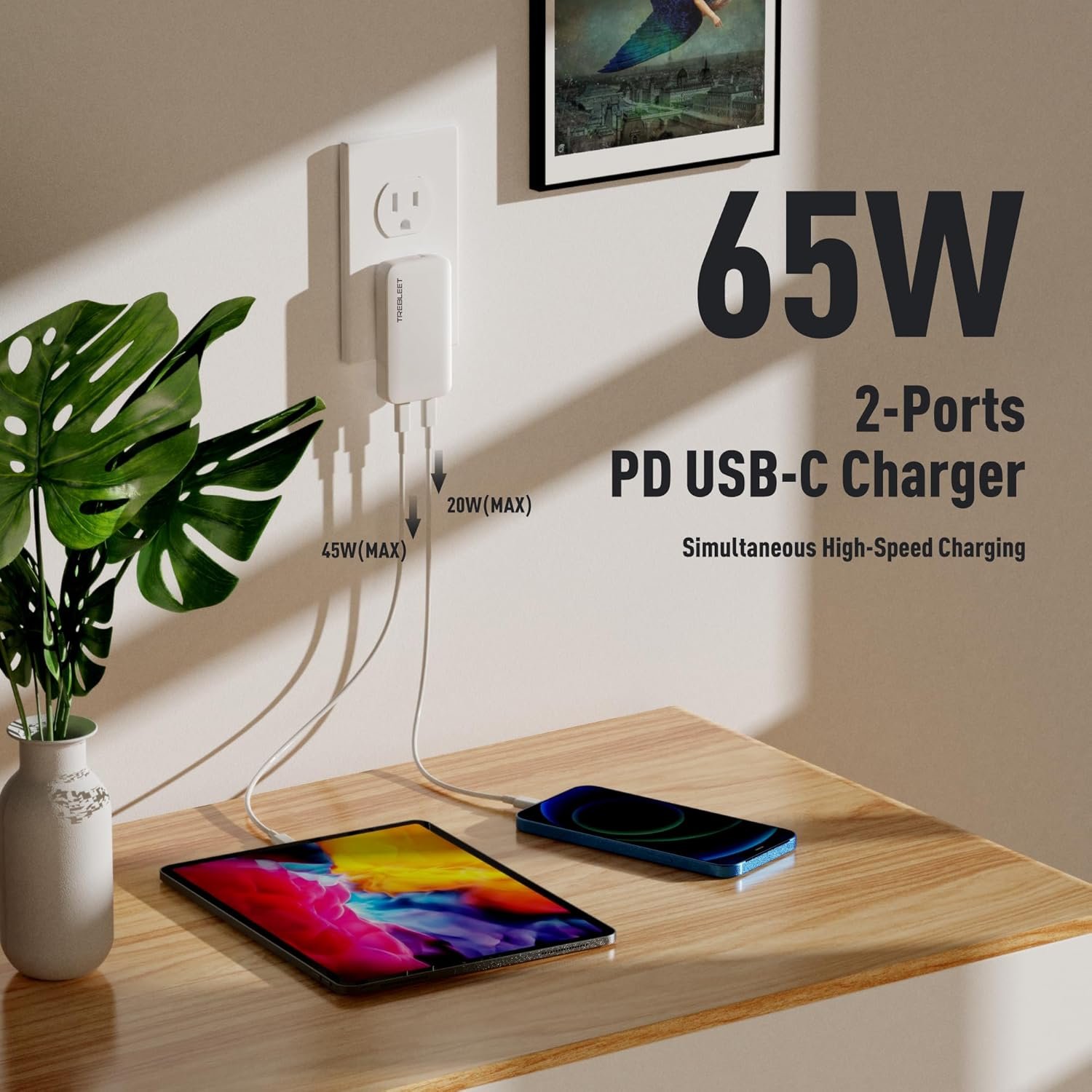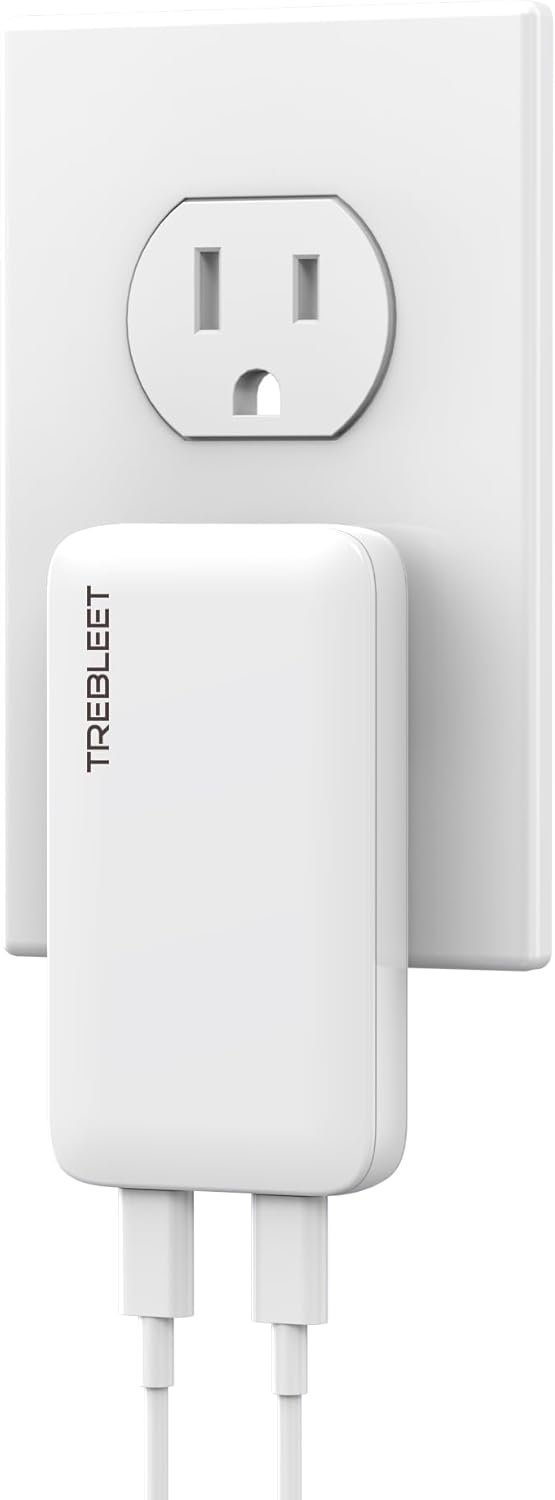 Flat 65W fast charger, easy to carry; The small yet compact TREBLEET USB-C Wall Charger sits flat to the wall for a non-intrusive fit to any wall outlet behind home furniture such as couches, beds and nightstands to charge your devices.Dual port design: Dual USB-C port design with frees you from messy chargers with various interfaces. This charger not only allows you to enjoy the fast charging function, but also solves the charging problem of two different devices at the same time.High-Speed charging: Access up to 65W (Requires E-Mark USB-C cable) when using a single USB-C port or 45W 20W when using both.Wide compatibility: Compatibles and works with most USB-C powered devices including for Macbook Pro, iPad Pro, Galaxy Book, Nintendo Switch Chrome Book series, iPhone series, Android tablet and more.Package included: 1x 65W Dual USB C PD Charger.