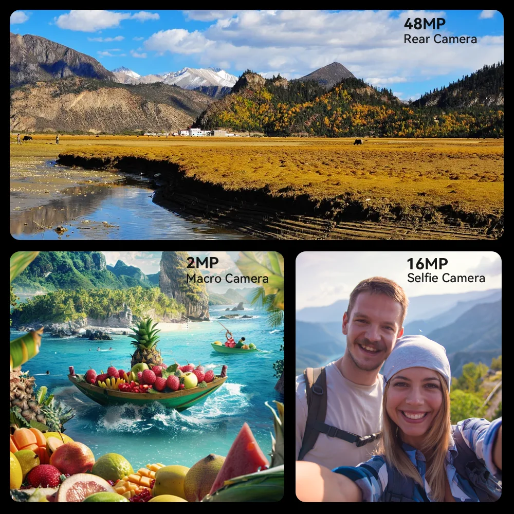 â€Â¢Triple Rear Camera Setup: Includes a 48MP PDAF main camera, a 2MP macro camera, and a sensor, with a 1A flash LED to capture perfect shots in any lighting condition.