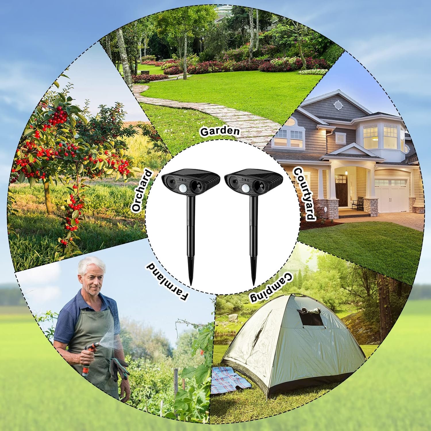 Design Concept: the ultrasonic animal repellers are mainly designed to repel a variety of animals away from your garden, such as cats and dogs, in this way, you can better protect your lawn and flower beds, keep them in good condition. Note:Different animals have varying tolerance for ultrasound, and when animals are in a state of hunger, the impact of ultrasound on them is limited