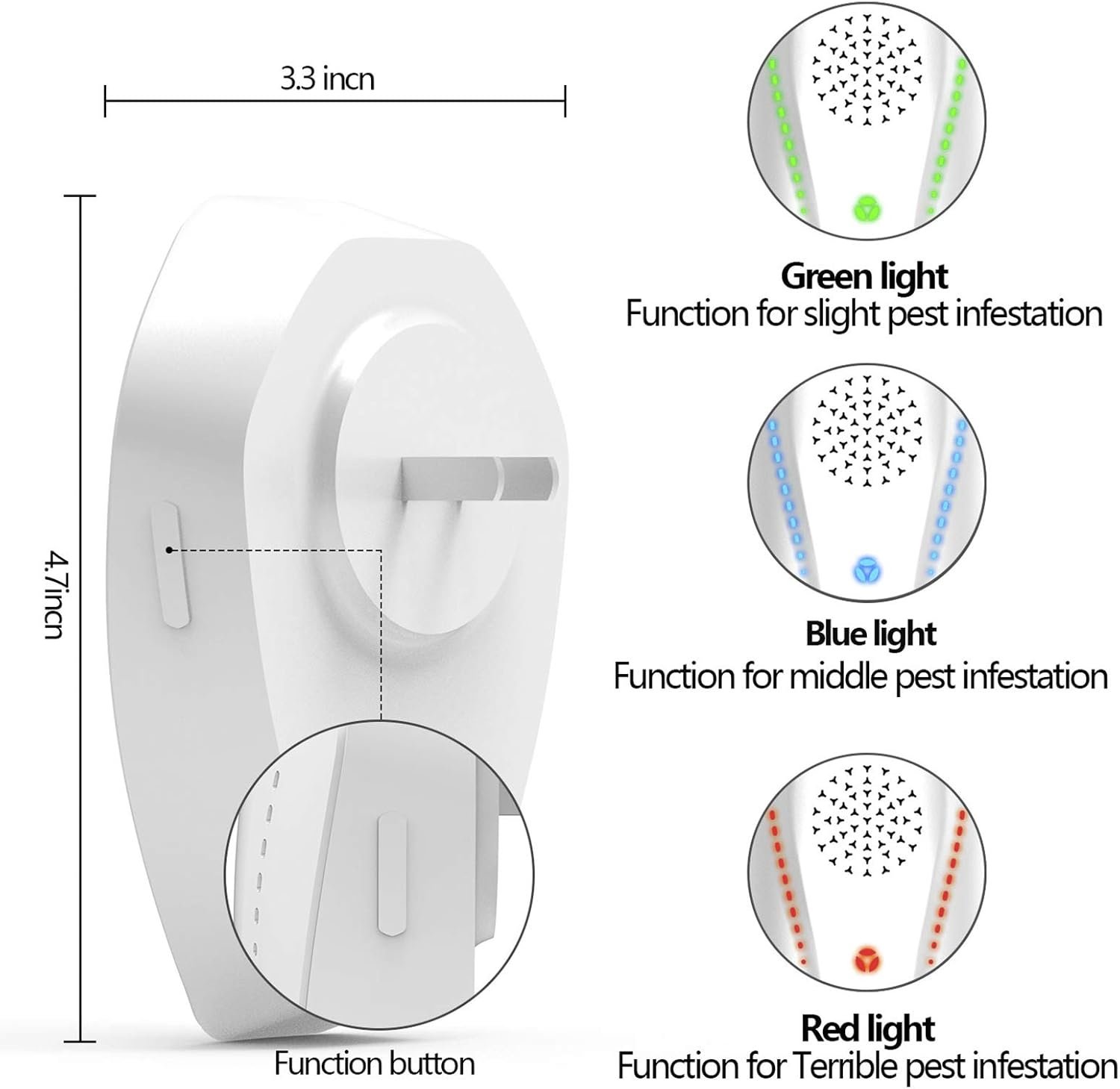 EASY TO USE : Simply plug our rodent repellent in the outlet, ultrasonic mouse repellent works when you notice the green light is on , which is used for minor pest infestation; Adjust to blue light mode if you have middle pest infestation, Turning on Red mode if you have terrible pests infestation.