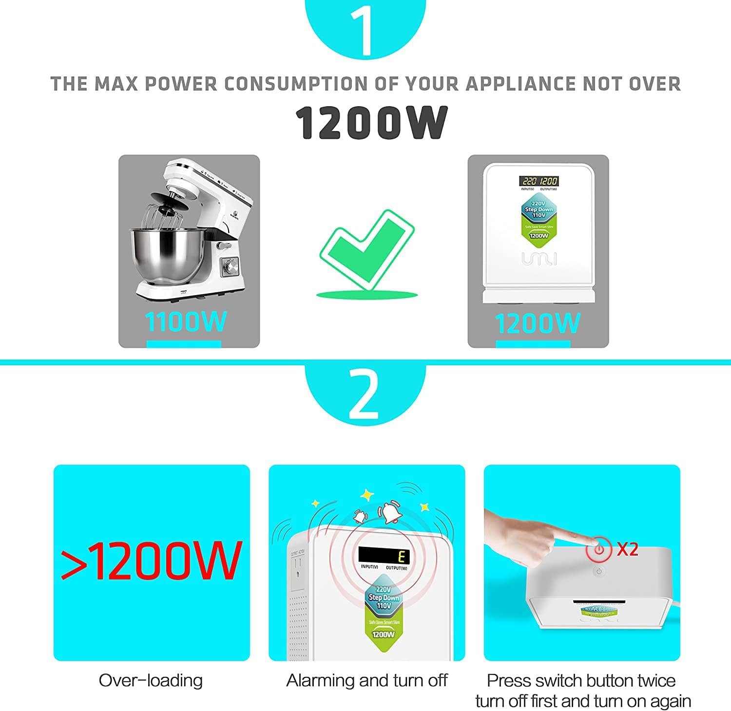 Highlighted 1: Prior to purchasing a voltage transformer in order to avoid users’ frustrations and unnecessary returns, it’s imperative to check and verify what does your appliance’s Maximum Power Consumption (MPC) is, which could be located on the device’s nameplate or written in user instruction guide. The appliance’s MPC must be less than this transformer’s Maximum Load Capacity (MLC).Otherwise it will NOT work. For safety concerns and optimal results, the manufacturer recommends that the transformer’s MLC should be equal or greater than your appliance’s MPC.Highlighted 2: If you live in the US or Canada (110 V) and you want to use appliances from Europe or Asia(220 V), please choose the 110v to 220v step up voltage converter. And if you live in Europe or Asia and you want to use electrical appliances from North America, please choose the 220v to 110v step down voltage converter.Highlighted 3: Do not make the converter works in full load for a long time. Make sure the total power consumption never exceed the rated power of converter.