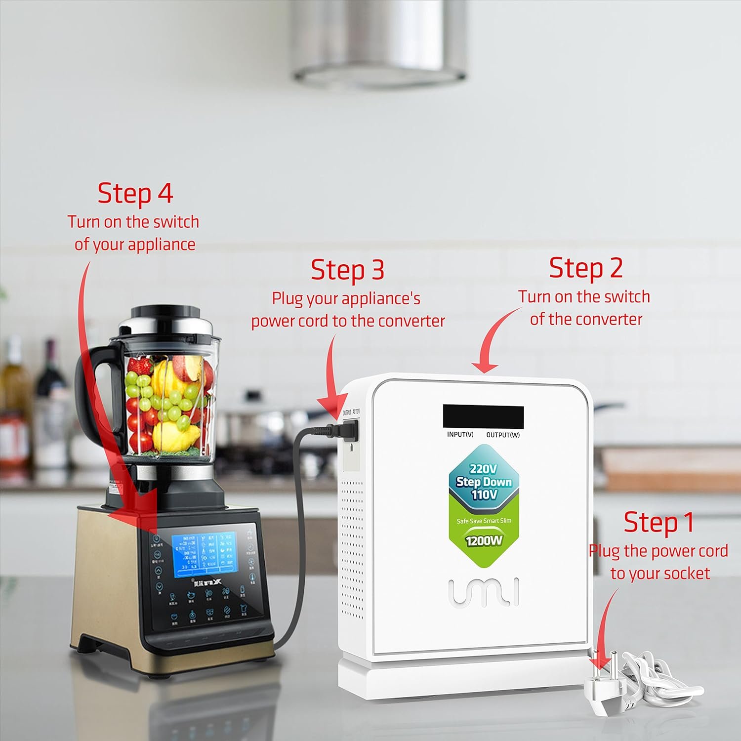 UMI Step Down 220V to 110V Power Converter work great with kinds of electrical appliances, devices and equipment. Such as US 120V hair dryer, rice cooker, coffee maker, air fryer, blender, toaster, air conditioner and so on.